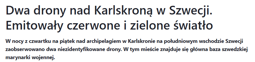 https://wiadomosci.wp.pl/dwa-drony-nad-karlskrona-w-szwecji-emitowaly-czerwone-i-zielone-swiatlo-7204337805978368a No strach się bać, czerwone i zielone na raz? to musiało sparaliżować ruch drogowy w połowie Szwecji! (sorry, musiałem) -