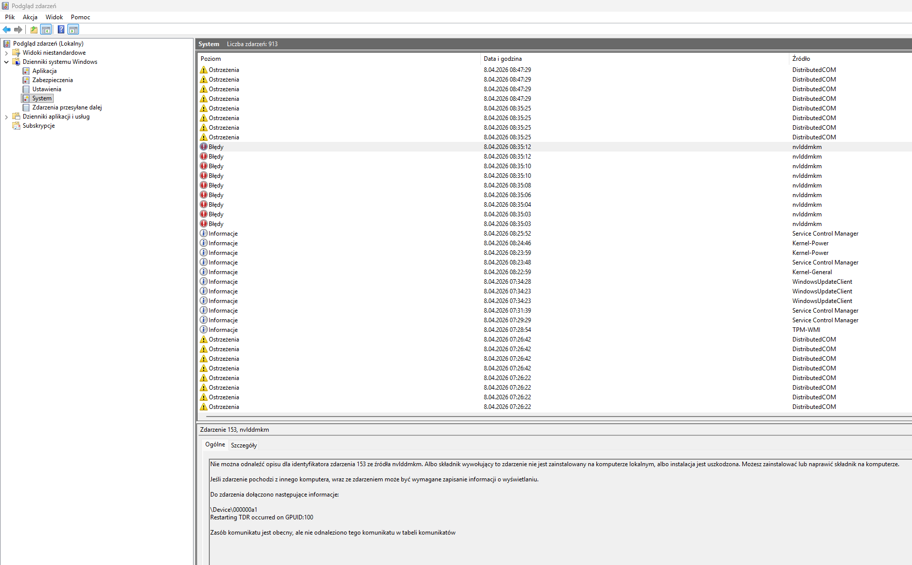 Kurła, napisać muszę bo się uduszę... Słynny poniekąd błąd nvidia 153 - odłączenie karty, wywalenie sterownika - ilu z użytkowników spotkało się z tym? Wcześniej, tj. co najmniej parę sterowników w dół nie widziałem błędu na oczy, ale dopadł i mnie, co bym nie robił, jakbym nie zmieniał sterowników, afterburnerów, oc, uv itp itd nic to nie daje wywalają się gierki z błędem 153 z podglądzie zdarzeń. Wczoraj już nawet kabel zasilania odpinałem i sprawdzałem z obu stron (5080) Co jest do jasnej anielki grane, ktoś ma jakiś pomysł? -