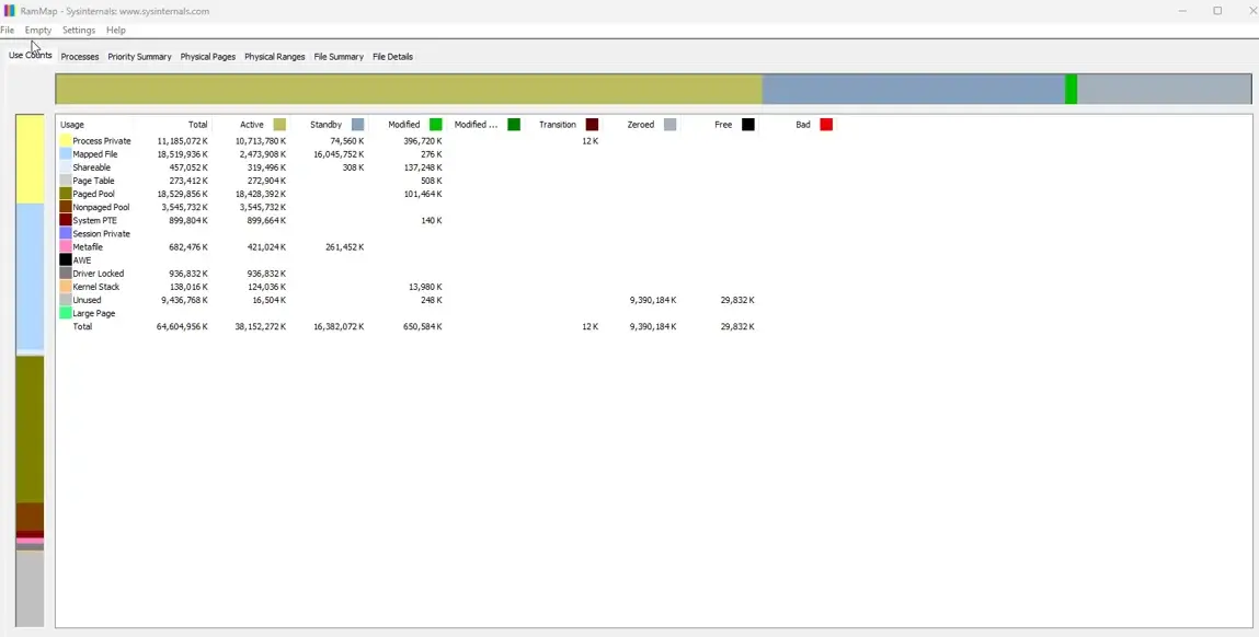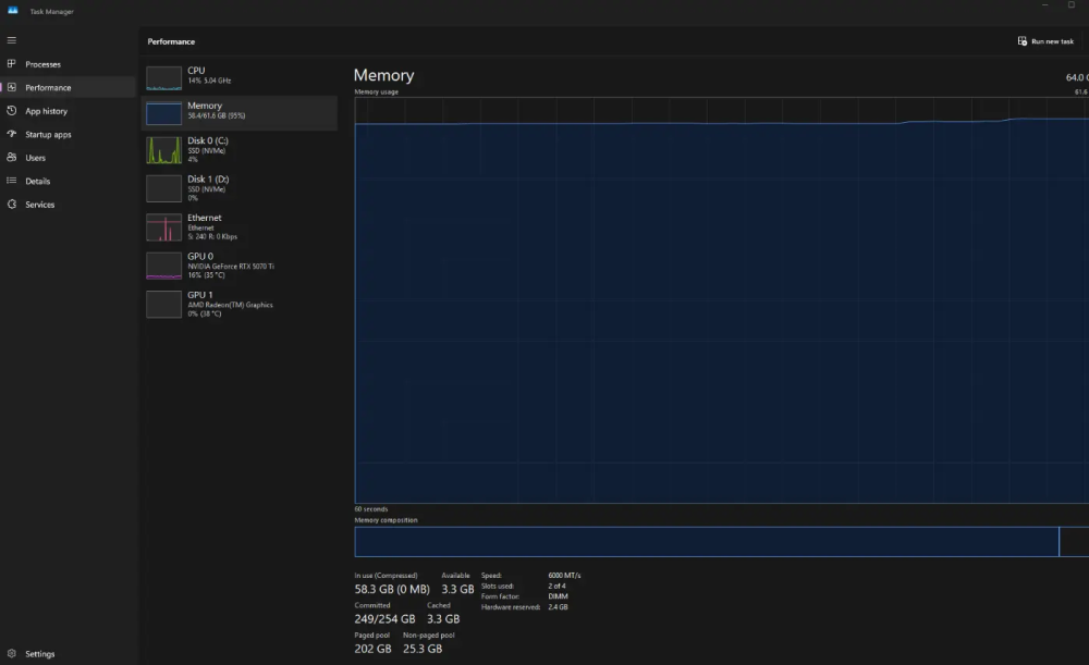 1. Witam ekspertów, Mam problem z pamięcią który mnie wykończył. RAM zapełnia się do 98/99% (60/64GB) w ciągu 2-7 godzin i komputer zaczyna zamulać/zamarzać. Czasami podziała kilka godzin i jest git. RAM wypełnia się sam z siebie, bez żadnego widocznego procesu w Menadżerze Zadań Wszystkie procesy razem pokazują ~20GB użycia, ale system raportuje 60GB Po restarcie wraca do normy, potem znowu narasta Co udało mi się znaleźć: Paged Pool: 142 GB (powinno być 1-2 GB) - Mój SSD płacze NonPaged Pool: 17 GB To się nie pokazuje w Menadżerze Zadań Tutaj przykładowo przywaliło 202gb/25.3 Ogółem problem następuje od 4 tygodni, nic specjalnego instalowane nie było. Przez ponad pół roku wszystko git było. Chciałbym obejść się od reinstalacji windowsa, dlatego szukam rozwiązania na tą chwilę bez tego. Przykładowy RamMap Jak ktoś ma jakiś fajny pomysł który nie będzie mnie kosztował 6k czyli wymiana ramu to byłoby mega. Profil EXPO wyłączyłem, wgl zresetowałem też cały bios, to samo. NDU próbowałem wyłączyć, to samo było. Mam tylko wielką nadzieję że to nie ramy bo pierdolnę przy tych aktualnych cenach