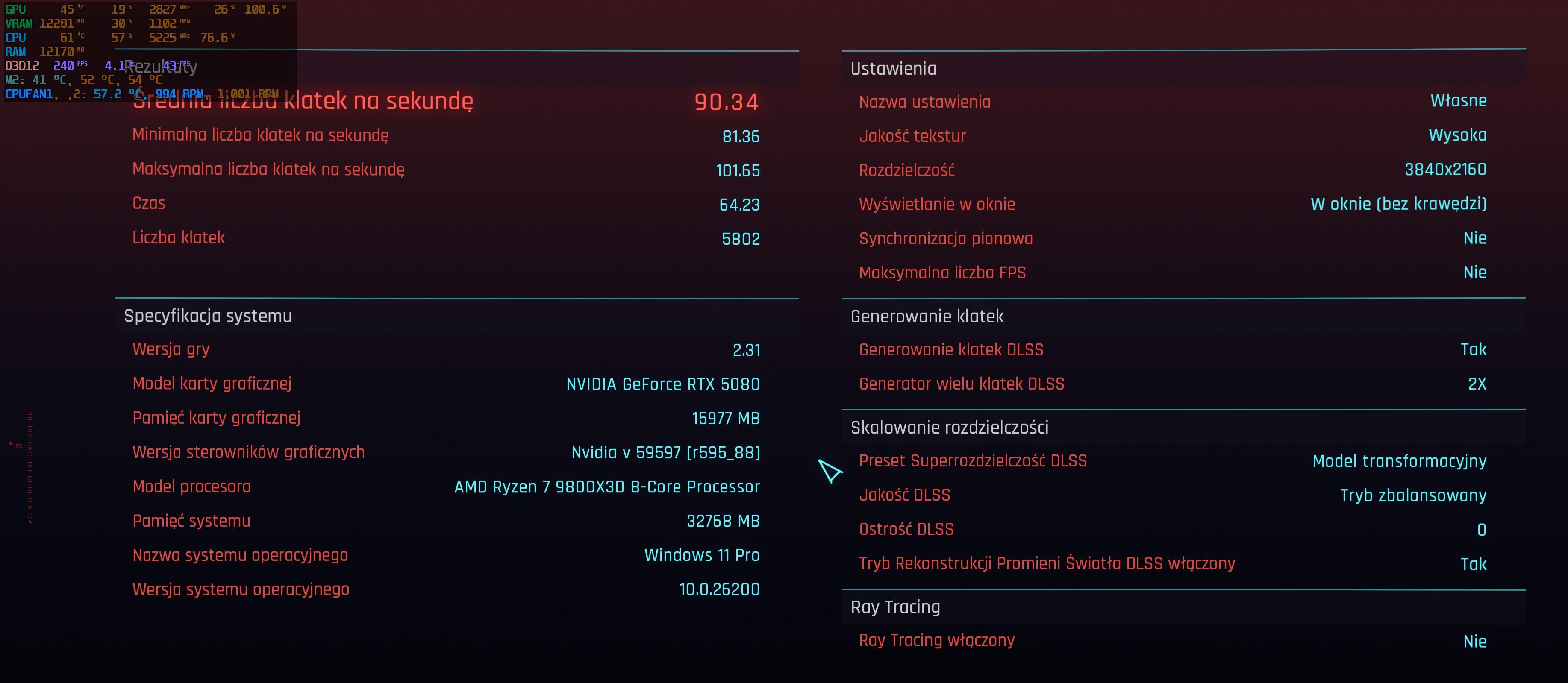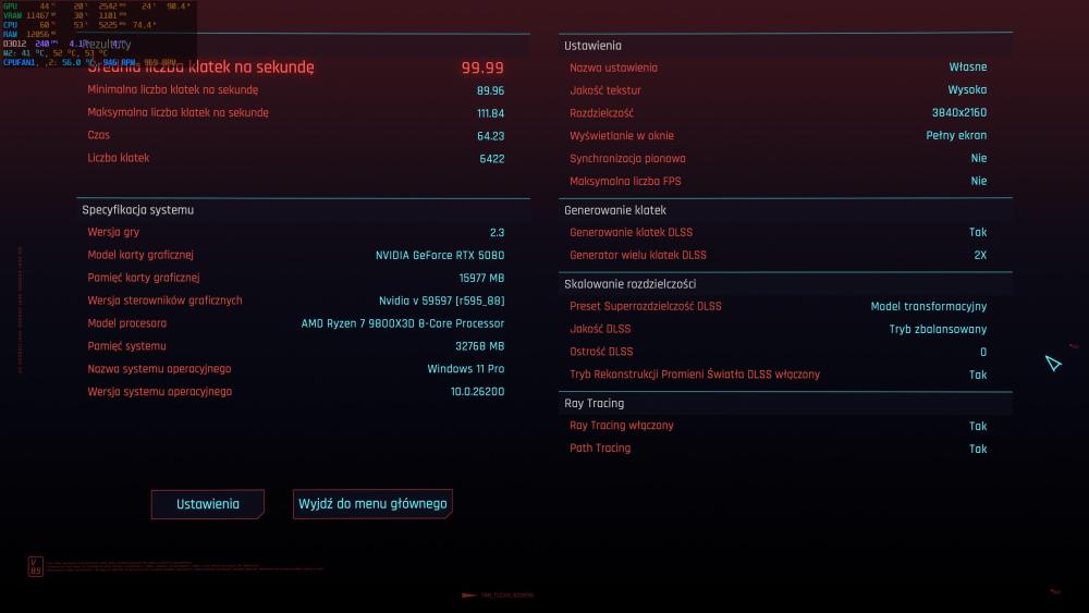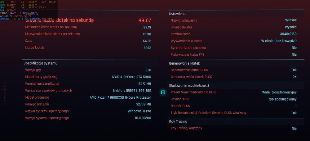 I kocówy tekścik stabilności w Cyberbugu, pograłem tez z 30minut żeby zobacz czy za działa, bo test to jednak za krótko. Test na max detalach z RR i PT w 4k , Balance dlss z x2 FG . A Gra tylko zmienione na x3 FG. Domyślne ustawienia gpu test: (nie wiem czemu tera pokazuje rt wyłączne jak mam właczone sprawdzałem i test wychodzi tak samo na oc .) Mam praktycznie jak ty @lukasso1202 +10fps pamiętajmy ze jest x2 wiec to jest 5 fps czy to podkręcanie warte świeczki ? .Chyba zależy od gry.