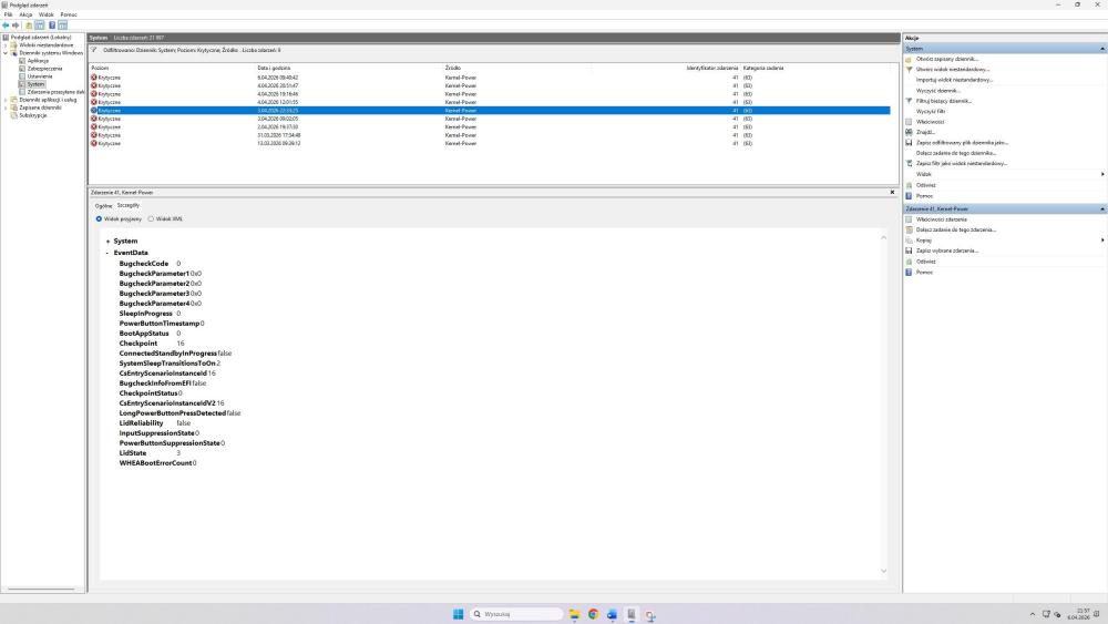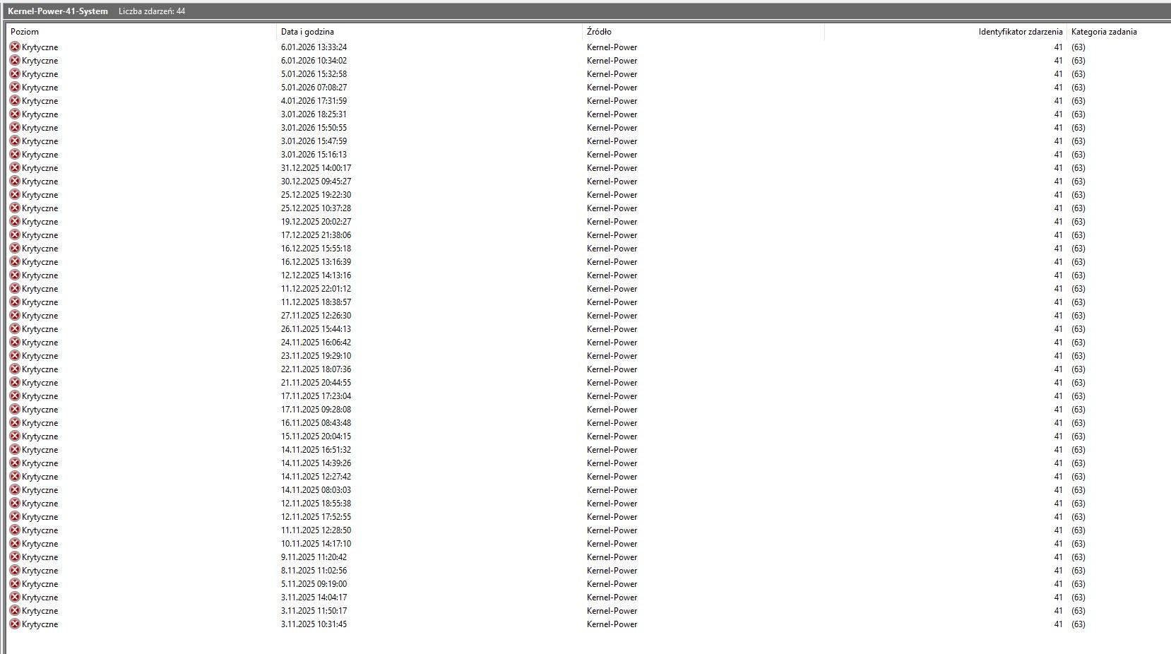W Dzienniku zdarzeń systemu Windows rejestrowane są zdarzenia krytyczne Kernel-Power ID 41.