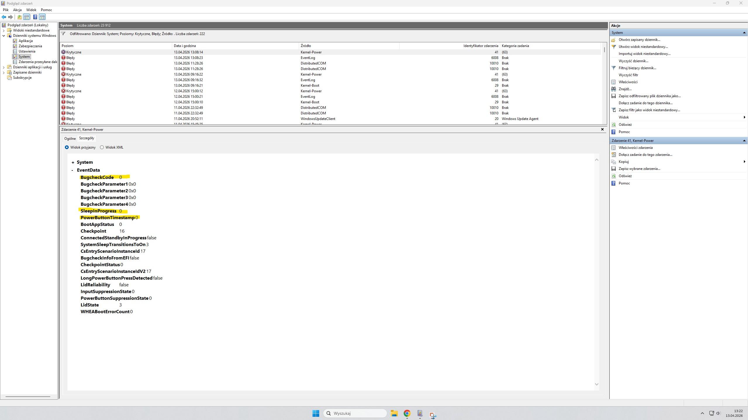 Udokumentowane daty zdarzeń z BugcheckCode=0 i SleepInProgress=0: M.in.: 06.02.2026, 07.02.2026, 08.02.2026, 15.02.2026, 24.02.2026, 13.03.2026, 31.03.2026, 02.04.2026, 03.04.2026, 13.04.2026