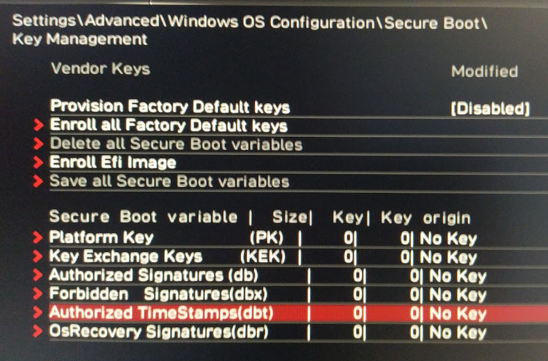 Wie ktoś może jak wejść w "setup mode" dla secure boot żebym mógł sam dodać klucze do biosu?. W niektórych płytkach jest bezpośrednio taka opcja, tutaj jej nie ma. Secure boot ustawiam na CUSTOM, oraz wyłączam dodawania kluczy fabrycznych zapisanych w BIOS. I następnie kasuje wszystkie klucze i robi się restart. Teoretycznie system powinien być w "setup mode" ale niestety nie jest. BIOS: 7C02v3M2 //edit Dobra już działa, dla potomnych, NAJPIERW ustawiamy CUSTOM, później wchodzimy do Key Management i ustawiamy Provision Factory... na Disabled. Po czym zapisujemy i restartujemy kompa z powrotem do BIOS. Ta opcja powinna być nadal Disabled, u mnie po pierwszym razie sama się ustawiła na Enabled. Teraz dajemy Dele all Secure Boot... 2x Yes i restart, wchodzimy na bios i patrzymy czy klucze są puste, jesli tak to jesteśmy w "setup mode": -