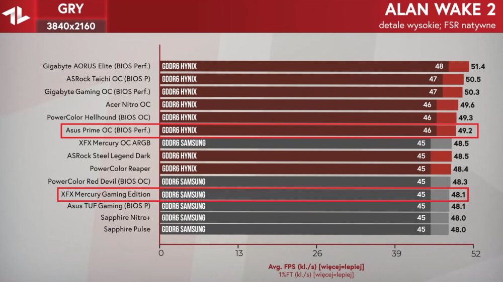 Przecież te zegary są podane, więc można sprawdzić. Biorąc Twój przykład Alan Wake 2, ale na stocku, bez OC, bo nie mam zamiaru wnikać, czy w teście potencjał Samsungów został należycie wykorzystany, bo one się kręcą kapkę wyżej niż Hynixy: I teraz bierzemy najbliższą taktowaniem parę na różnych rodzajach kostek. Różnica wydajności 2%. Zależy, w co grasz. Są takie gry, gdzie nie będzie różnicy, a są takie, gdzie będzie znaczna. Żaden test mieszany CPU/GPU nie odda tych zawiłości, które jako gracz odczujesz w praktyce. -