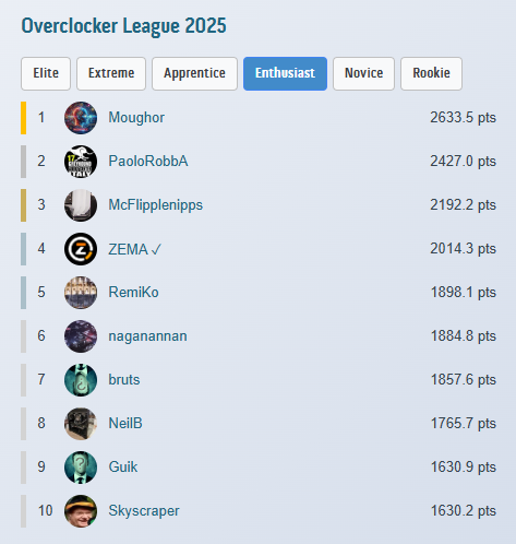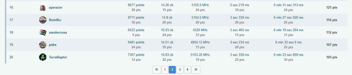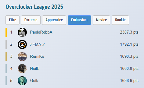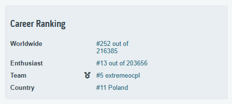Na przełomie kwietnia oraz maja na HWBot'cie odbyły się zawody w męczeniu platformy X58 LGA1366: "Hyperless Havoc", w których tak BTW zwyciężył mój drużynowy kolega Emil.SU Oto jak to wyglądało u mnie i z mojej strony: To już jest bajzel "po wszystkim" - takie ostatnie zdjęcie podsumowujące tę męczarnię Ta klawiatura nie jest brudna, jest tylko "wybiórczo zżółknięta" i była mi potrzebna, bo jest na PS/2, a musiałem wyłączyć porty USB na płycie, aby podkręcić pamięć ram - klasyka Pamięta czasy Athlon'a XP Zestaw "zbyt nowych" modułów + HyperX'y, które ogólnie były raczej średnie, chociaż wyglądają poważnie Użyłem dwóch platform z kolekcji: Fajnie było w końcu móc rozpakować Noctuę NH-D14 i zmontować ją zgodnie z przeznaczeniem oraz czasowością Chyba to już nikogo nie zdziwi, ale ja naprawdę lubię Mugeny Rampage III Gene był jednak nieco bardziej zmęczony życiem i potrzebował pomocy z mojej strony, aby zapiąć trzeci kanał pamięci: Musiałem ręcznie szpilką dorobić brakujący pin w slocie C1 odpowiadający za zasilanie SPD Działa, zostawiam, demontować nie zamierzam ... Kilka standardowych testów ode mnie: Nie jest to max OC, bo zawody miały ograniczenie do 4505MHz na procesorze/cache i jakoś tak nie cisnąłem procka dalej ... Moje submity na zawody: Do SuperPi 32M wyleciał mi trzeci kanał, ale wydajność była zadowalająca Spi32M oraz PYPrime przy DDR3-2144 CL7 na modułach Corsair'a XMS3 DDR3-1333 CL7 opartych o kostki Elpida BBSE Na takich modułach, to nawet fajny ten triple channel I na koniec valid z najwyższego taktowania pamięci ram, gdzie nie pokusiłem się o żadne modyfikacje BIOSu: DDR3-2772 https://valid.x86.fr/juf80b Platforma bez problemu bootowała nawet na DDR3-2800, co widać na powyższym zdjęciu. Gorzej było z wejściem do Windowsa Koniec końców zająłem 21 miejsce na 32, czyli nie jest aż tak źle, biorąc pod uwagę, że w sumie to całkowicie pierwszy raz miałem styczność z platformą LGA1366 i dopiero jak ją odpaliłem, to zrozumiałem ile rzeczy wcześniej nie wiedziałem ... W międzyczasie testowane były również inne platformy oraz powiększyła się moja kolekcja sprzętu o kolejnego BOX'a: Dla tej płyty kupiłem jeszcze przy okazji procka Devil's Canyon i7-4790K, aby tak ładnie pasowało z Z97. Szybki test: I nieco poważniejszy test: Wyniczki: Procek obecnie czeka na odrobinę czasu oraz delida, bo glut pod czapką jednak daje się we znaki przy obciążeniu AVX'em. Ciekły metal już kupiony, widoczny na ostatnim zdjęciu na samym dole dzisiejszego wpisu ... Z innych rzeczy, to testowałem ostatnio jeszcze te "dziwniejsze rdzenie" i tak wleciał na testy procek 3 rdzeniowy oraz 5 rdzeniowy: Jest to Athlon II X3 450 z odblokowaną pamięcią Cache L3 6MB i wyłączonym czwartym (sprawnym) rdzeniem: Piąte miejsce na świecie? Czemu nie! https://hwbot.org/benchmarks/7-zip/submissions/5849578 Było przez chwilę #4, ale dzisiaj TAGG wrzucił swój wynik na 6.5GHz A to jest Phenom II X4 960T z odblokowanym piątym rdzeniem: Ósme miejsce na świecie? Ależ oczywiście! https://hwbot.org/benchmarks/7-zip/submissions/5850598 Fajne to były wtedy czasy z tym odblokowywaniem procesorów Jedne z fajniejszych, które lubię wspominać ... A w następnym tygodniu czeka mnie odpalenie kolejnej platformy, tym razem X79 na LGA2011, na której odbędą się zawody w męczeniu procka i7-4930K: Zobaczymy jak mi pójdzie i co potrafi ta sztuka procka, bo dopiero co go nabyłem i nie znam jeszcze jego możliwości ... Aha, wbiłem w ostatnich dniach #3 miejsce w rankingu Entuzjastów na sezon 2025: I otrzymałem za to kolejne osiągnięcie: Fajnie też to wygląda od samego początku kariery (od 2008 roku): I to by było na tyle ode mnie z ostatniego czasu