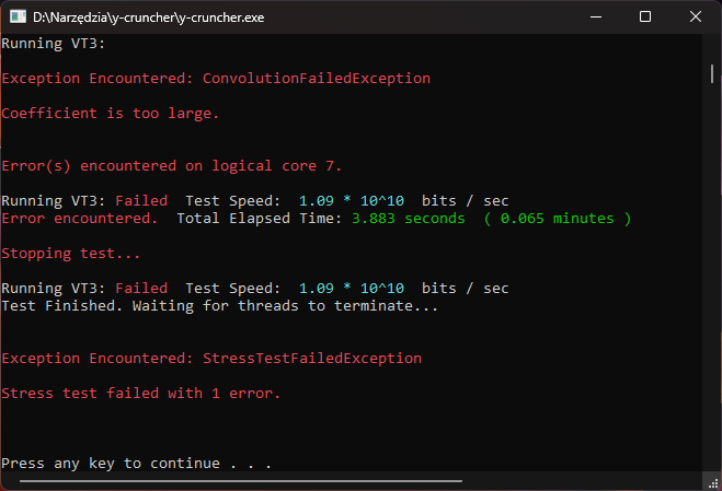 Witam , posiadam procesor i7-14700K , płyta główna MSI Z-790 Tomahawk , pamięć RAM Lexar 6400 Mhz o pojemności 32GB , ustawienia w Biosie na Intel Default Setting , wczytany profil XMP , reszta nie ruszana , podczas testu y-cruncher VT3 wyskakuje mi taki błąd . Co ten błąd oznacza i jaka może być przyczyna .