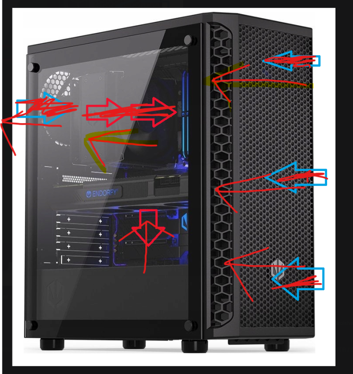 masz gpu w obudowie: ah bez tla... ale nie wazne. gpu bierze zimne powietrze z dolu i ochladza komponenty -> nastepnie powietrze jest wypychane przez jedyne sloty jakie sa czyliu te gdzie podlaczasz kable - z tylu obudowy. cieple powietrze also - wg fizyki leci do gory -> wiec obok bloku cpu - dlatego tylny wentylator musi wypychac powietrze a nie wpychac bo robi z tego tornado i kupa -