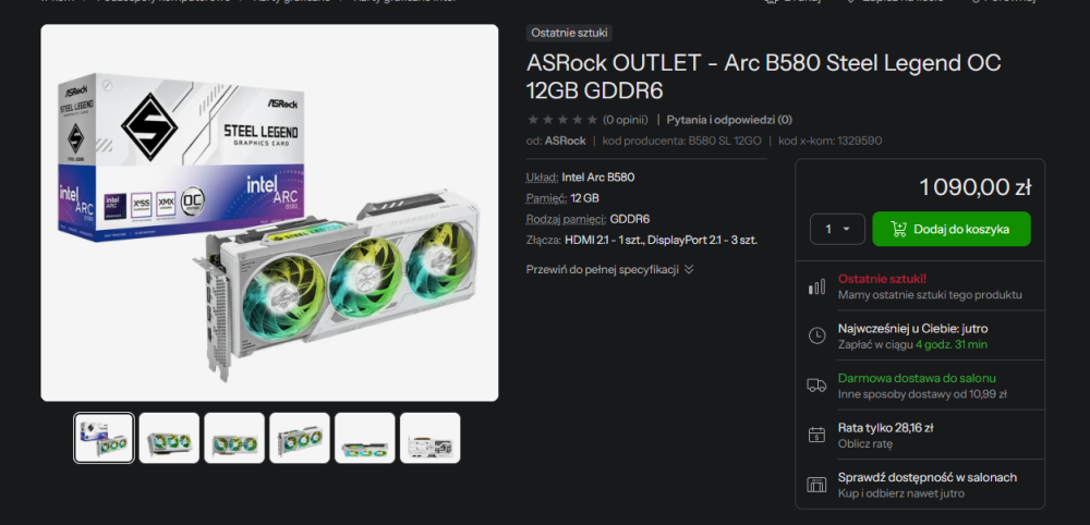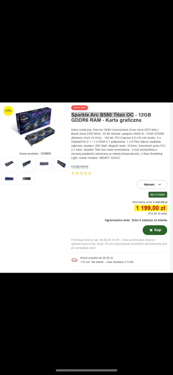 Używana, stan oceniam na 5+, kompletna, bez wad i zniszczeń (bardzo dbam o sprzęt komputerowy). Jestem pierwszym i jedynym właścicielem, kupiona 04.2024 w xkom (gwarancja do 04.2026). Głównie korzystałem do prac biurowych oraz multimediów, czasami do grania i montażu, ale rzadko. Karta jest bezproblemowa i bardzo cicha. Sprzedaję, bo przesiadam się na B580.