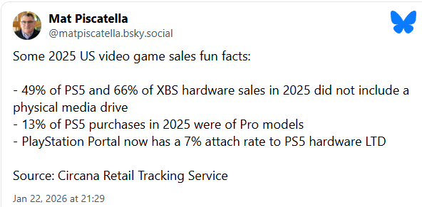 To po kolei: 1) Tak, PS5 pro pozwala na grę w lepszej jakości niż PS5. To raczej oczywiste, bo pod kątem GPU i dostępu do technologii jest to konsola wyraźnie szybsza. Byłoby deko dziwnie i nieśmiesznie gdyby było inaczej. Tego nikt tutaj nie negował. Zagotowałeś się siłą rozpędu. 2) Ja nie ogół, ale też Ty nie sprzedajesz prawd objawionych. Natomiast ja się opieram o statystykę posiadania sprzętu na rynku, a ta jest pi razy oko taka: Czyli PRO, w ponad rok od wejścia na rynek, zestawione z PS5 (którego rynek pierwotny jak i wtórny jest pełny) to wciąż raptem 13% w 2025 r. No nie ma szału. Czyli 87% ludków wybrało jednak plebs jakimś dziwnym trafem. O tym pisałem, o potrzebach. I tak, ma wspólnego. Nikt nie neguje tutaj faktu, że PRO jest pod kątem GPU najwydajniejszą konsolą obecnie. Niemniej przyrosty są coraz bardziej niewspółmierne do obecnie prawie 2x ceny dla casuala żadne RT-sroze czy pisser 2.0 nie pokryją dwukrotności nakładu na zabawkę. Z podkreśleniem CASUALA. Czytałeś cały mój post czy tylko się zapaliłeś bo ktoś ma inne zdanie? 3) A ja nie napisałem że mi nie pasuje. Mam od dnia 0 - ale ja nie jestem casualem, mogę sobie na taki zakup pozwolić i mi to zwiewa. Natomiast nie jestem ślepy i otumaniony Gdzie tu masz napisane że mi cena nie odpowiada? Nie odpowiada mi jej zmiana in plus, bo zawsze była in minus. Tendencja, a nie wartość. Amen.