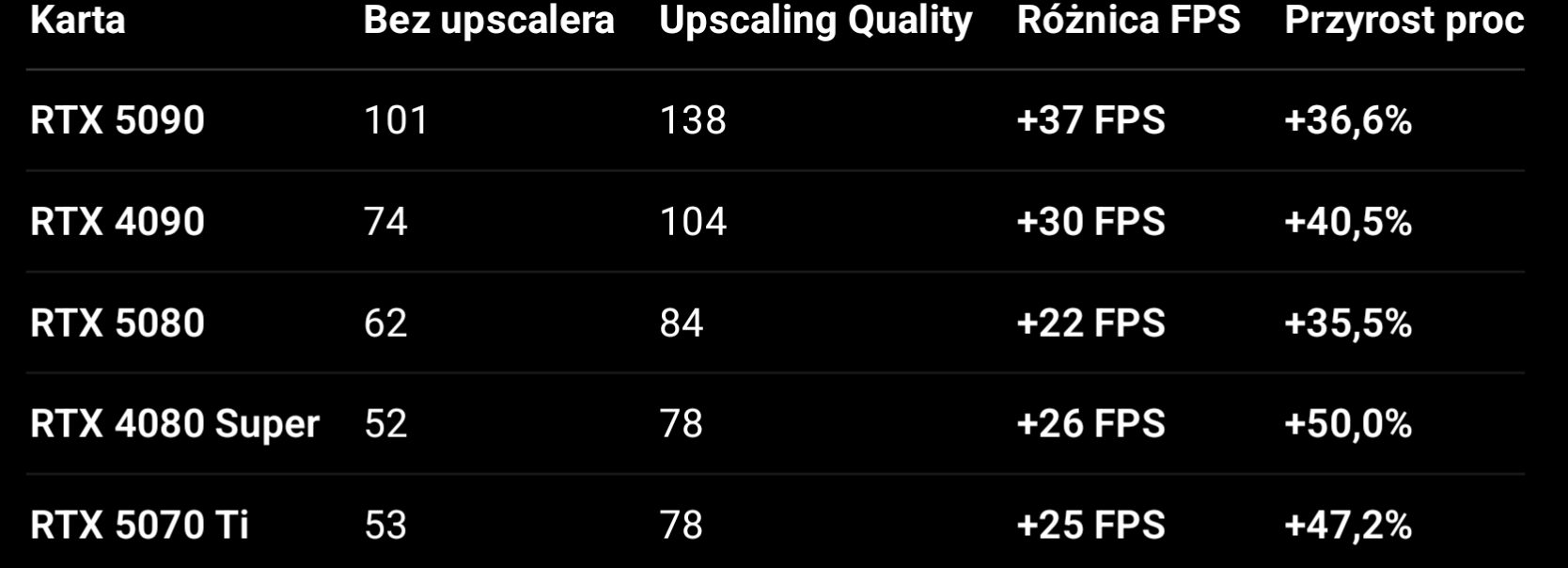 DLSS Q + FG max detale daje lepszy efekt niż DLSS Q + FG i średnie detale. Na RTX 4090 musisz już obniżyć detale, ale DLSS Q+FG dalej musi być załączony. Te 30-40% robi bardzo dużą różnice, bo 4090 leci na styk lub poniżej przy włączonym DLSS Q + FG, więc 5090 odczuwalnie daje kopa. Druga sprawa, że już w tym samych scenariuszach na 5090 nie trzeba załączać FG np. Wuchang, czy w DL: The Beast jak wyjdzie RT, a są gry gdzie i DLSS Q niepotrzebne jak np. wspomniany KCD2.