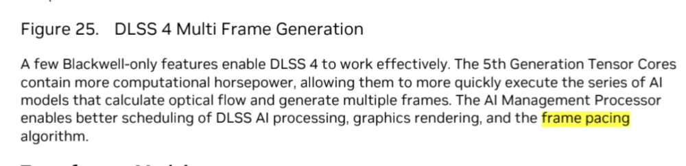 Tensor Core 5. gen z FP4 to główna zmiana względem Ady, a można przeczytać na stronie NVIDIA coś takiego: Figure 25. DLSS 4 Multi Frame Generation A few Blackwell-only features enable DLSS 4 to work effectively. The 5th Generation Tensor Cores contain more computational horsepower, allowing them to more quickly execute the series of AI models that calculate optical flow and generate multiple frames. The AI Management Processor enables better scheduling of DLSS AI processing, graphics rendering, and the frame pacing algorithm." "Kilka funkcji dostępnych wyłącznie w Blackwell umożliwia efektywne działanie DLSS 4. Rdzenie Tensor piątej generacji oferują większą moc obliczeniową, co pozwala im szybciej wykonywać serię modeli AI obliczających przepływ optyczny i generujących wiele klatek. Procesor zarządzania AI umożliwia lepsze planowanie przetwarzania AI DLSS, renderowania grafiki i algorytmu tempa klatek."