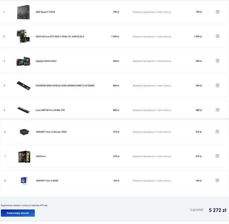 Hej! Jeżeli jest jakiś ogólny temat na ocenę zestawu, to z góry przepraszam modów i proszę o przeniesienie tematu. Syn znajomej złożył sobie sprzęt, prawdopodobnie do grania i znajoma pyta się, czy można w nim coś ulepszyć nie zwiększając znacząco kwoty 5,3 tyś. zł Niestety ja wypadłem z obiegu już dawno i nie wiem, co teraz warto kupować, a co nie. Będę wdzięczny za pomoc. Dzięki. CPU: AMD Ryzen 5 7600X GPU: ASUS GeForce RTX 5060 Ti DUAL OC 16GB DLSS 4 Płyta głowna: Gigabyte B650 EAGLE Ram: GOODRAM IRDM 32GB [2x16GB 6400MHz DDR5 CL32 DIMM] Dysk: Lexar NM790 Pci-e NVMe 2TB Zasilacz: ENDORFY Vero L5 Bronze 700W Obudowa: Krux EXO Chłodzenie: ENDORFY Fera 5 ARGB tutaj jak to wygląda cenowo na Komputroniku: