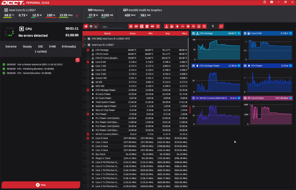 Mam (od dawna) problem z laptopem/tabletem z tytułu (wersja Intel Core i5-1135G7, 16 GB RAM, 256 GB SSD, Windows 11 Pro 24H2). Najpierw wariował ekran przy dotyku i aktualizacje Windows Update nie działały. Później "udało się" to wymienić na okresowe zawieszanie się, BSOD i restarty z kodami błędu: SYSTEM_SERVICE_EXCEPTION IRQL_NOT_GREATER_OR_EQUAL_ KMODE_EXCEPTION_NOT_HANDLED_ CLOCK_WATCHDOG_TIMEOUT_ PAGE_FAULT_IN_NONPAGED_AREA_ APC_INDEX_MISMATCH ATTEMPTED_EXECUTE_OF_NOEXECUTE_MEMORY Z innych objawów: niestabilne działanie przy wysokim obciążeniu CPU, nagrzewanie się urządzenia w rejonie CPU, skrócony czas działania na baterii. Objawy występują nieregularnie - czasem laptop działa kilka godzin stabilnie, a czasami laptop kilka razy z rzędu zawiesza się tuż po uruchomieniu systemu. System był trzykrotnie instalowany na czysto z oficjalnego obrazu .iso. BIOS najnowszy. Z benchmarków/testów zrobiłem: MemTest86 (pełny, 4 cykle) - brak błędów OCCT CPU (SSE, tryb Steady), 20 min - brak błędów OCCT CPU (AVX2) - restart po 15–20 sekundach obciążenia CrystalDiskInfo - stan dysku 99%, brak błędów SMART Battery report (powercfg /batteryreport) - DESIGN CAPACITY: 47,355 mWh, FULL CHARGE CAPACITY: 35,797 mWh, CYCLE COUNT: 152 Co mogę zrobić dalej? Wygląda to chyba na problem z sekcją zasilania płyty głównej