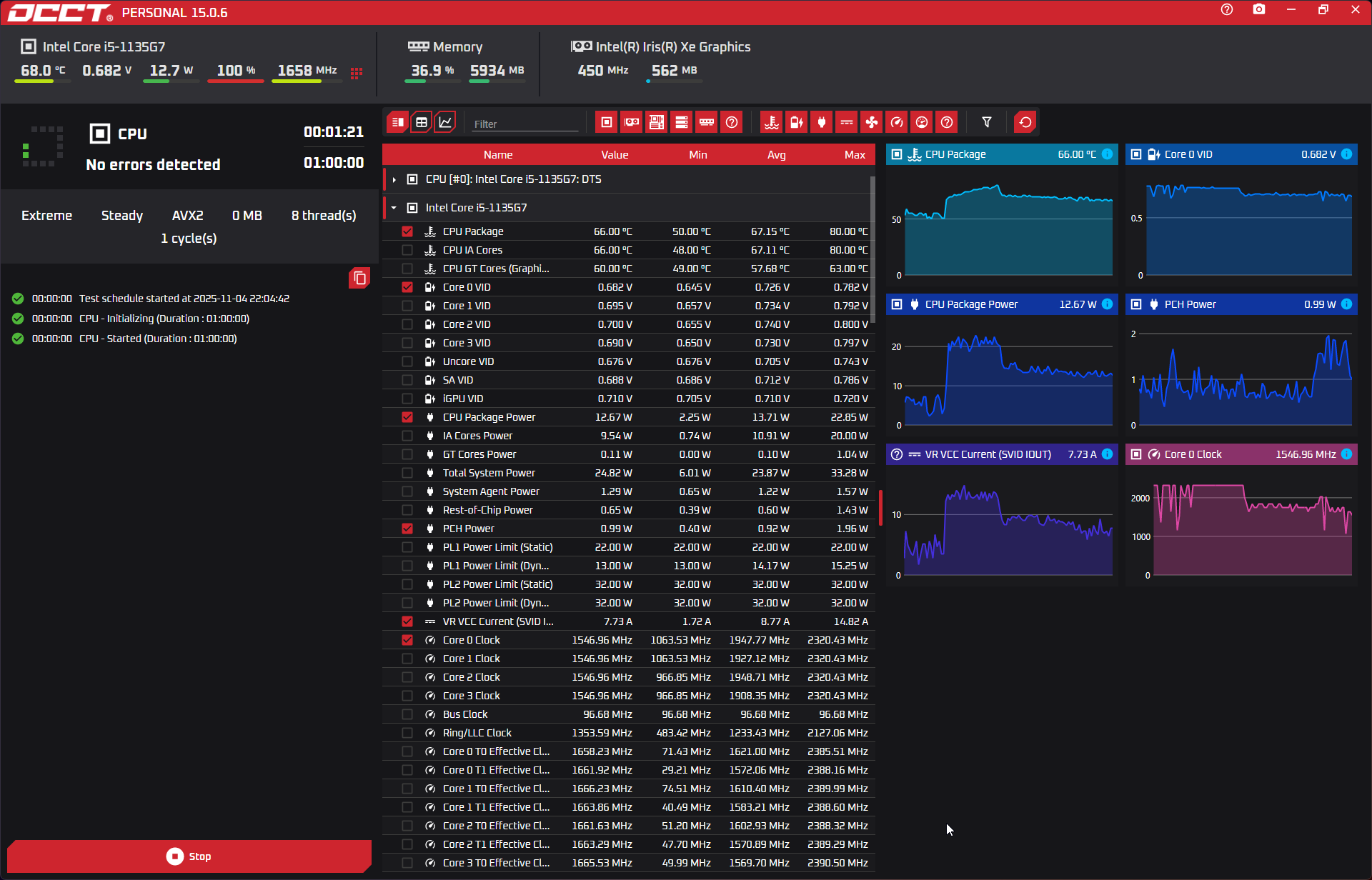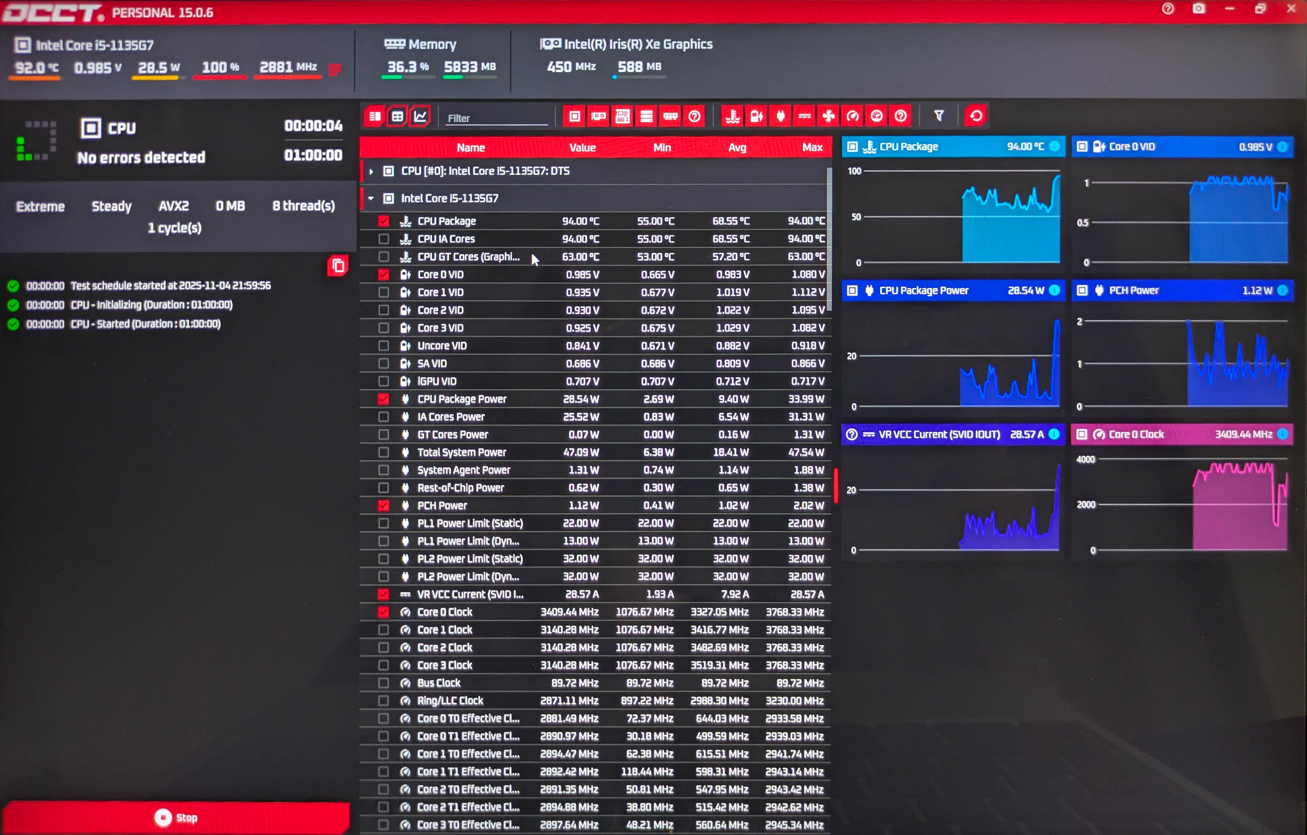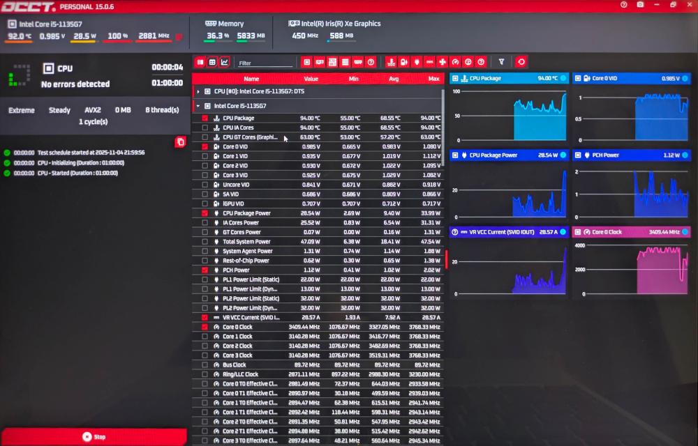 Dziwne rzeczy się dzieją, sensory potrafią podać na przemian temperaturę samego CPU 97° i ~60° parę razy na przemian... AVX2 bez Turbo boost: SSE z Turbo: AVX2 z Turbo (zdjęcie z zfreezowanego ekranu, zaraz później restart z CLOCK_WATCHDOG_TIMEOUT): OCCT w wersji darmowej chyba nie zapisuje logów -