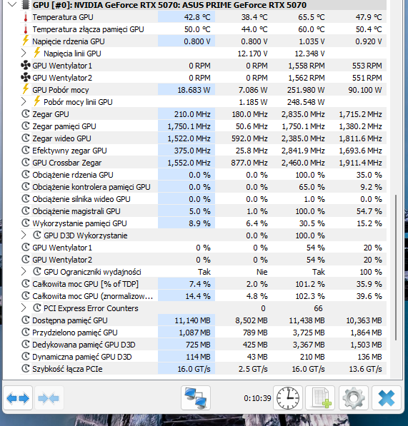 9. Tutaj HW INFO podczas gry w batka. Mam też zapisany plik CSV. Na ustawieniach niskich + dlls (jakosć) fps dalej spadaja, do 87/90 co najlepsze, na ustawieniach niestandardwoych gdzie niektóre opcje sa na ultra / wysokie mam podobbne fps. Czyli przedziął od 130 do spadających nawet 80.. Tutaj nagranie jak zachowuja sie klatki. Pierwsza częsć filmu to ustawione wsio na niskie, druga część do niestandardowe, gdzie 70/80% procent ustawien to niskie ale 3 pierwsze pozycje wysokie / ultra. DLSS Quality