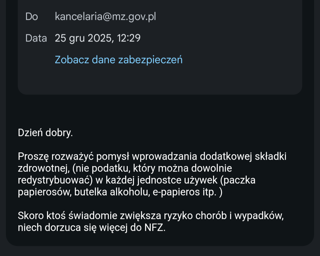 @LYCONE Napisałem do ministerstwa zdrowia, składce zdrowotnej w każdej paczce papierosów. Skoro ktoś pali i świadomie zwiększa swoje koszty leczenia to niech płaci więcej.