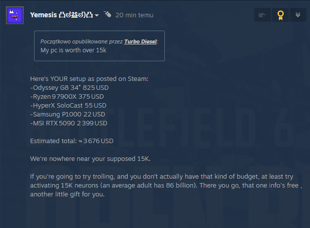 Chłop płacze na steam że ma kompa za 15k i nie może uruchomić gry, ktoś mu tam podliczył wartość kompa i odpisał: