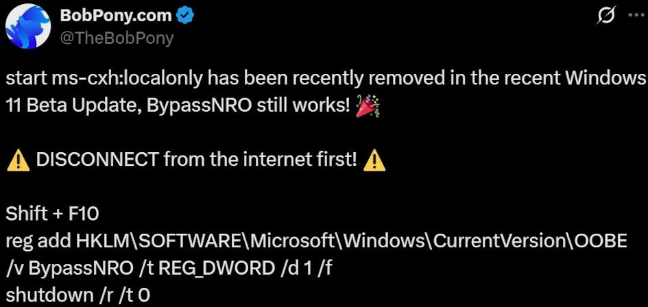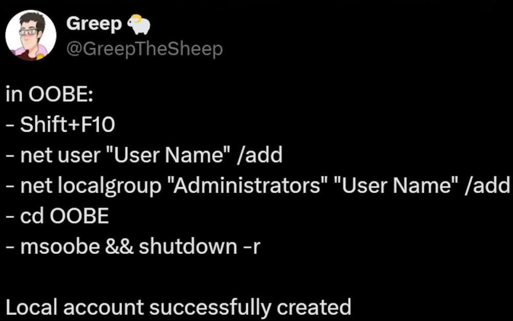 Tworzenie kont w najnowszej wersji 25h2 nadal działa, sprawdzone w październiku 2025. Ważne, żeby na czas instalacji wyjąć kabel od internetu z płyty głównej komputera oraz nie łączyć się z siecią bezprzewodową wifi. Edit: Microsoft poinformował o blokadzie poleceń oobe\bypassnro oraz start ms-cxh:localonly w najnowszych wersjach testowych windowsa 11, dlatego nie wszystkie oplecenia mogą zadziałać. Najprościej dodać konto lokalne w programie rufus wybranie odpowiedniej opcji w ustawieniach, podczas tworzenia botowalnego pendrajwa. lub Ctrl+F10 i w konsoli wpisać: start ms-cxh:localonly i enter, pojawi się nowe okno z tworzeniem konta lokalnego. To jest najprostsza i najlepsza opcja. Instrukcja w formie wideo: https://www.youtube.com/watch?v=yuUka7r6eLg&t=833s Jeśli nie działa, spróbuj kolejnych: CTRL+SHIF+F10 reg add HKLM\SOFTWARE\Microsoft\Windows\CurrentVersion\OOBE /v BypassNRO /t REG_DWORD /d 1 /f i kliknij enter, następnie wpisz: Shutdown /r /t 0 i kliknij enter Gotowe, jeśli nie chcesz wpisywać ręcznie z klawiatury, to możesz skopiować do notatnika, zapisać plik na pendrive, i z cmd podczas instalacji windowsa uruchomić notatnik, skopiować z pendrive całą komendę którą zapisałeś. lub Ctrl+F10 i w konsoli wpisać: oobe\BypassNRO.cmd i enter, w okienku na dole pojawi się nowa opcja do kliknięcia: nie mam połączenia z internetem. lub Ctrl+Shift+F3 i od razu wchodzi się na konto administratora, tam już wystarczy w ustawieniach systemu dodać konto lokalne, którym potem można się zalogować tylko system wymusza zmianę hasła przy 1 logowaniu. Trzeb pamiętać o wyłączeniu zbędnych opcji w ustawieniach windowsa. lub Wymagające wpisania większej ilości linijek w terminalu: lub