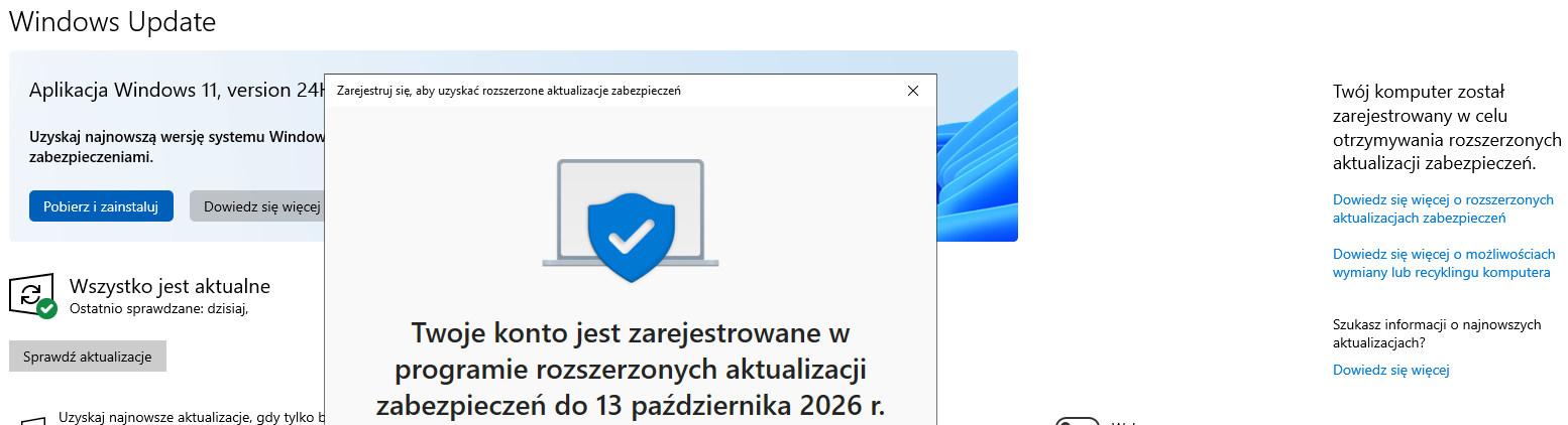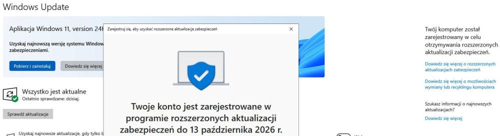 Jak włączyć rozszerzone aktualizacje esu dla windowsa 10 za darmo*, informacja dla osób którym nie wyświetla się powiadomienie o możliwości aktywacji przedłożonego wsparcia, tylko o samej aktualizacji do windowsa 11. U mnie tak to wyglądało: Ważne: Microsoft wymaga żeby zrobić to co opisałem poniżej na koncie administratora komputera. Nie lubię usług microsoftu dlatego, połączę konto administratora (nie ma innego wyjścia) z kontem microsoft, a do codziennego użycia założę drugie konto lokalne, bez logowania się do konta microsoftu. Przy tym microsoft wymaga, żeby zalogować się na główne konto administratora minimum raz na od 30 do 60 dni, żeby utrzymać status przedłużonego wsparcia, jeśli dobrze zrozumiałem. Czyli logowanie raz w miesiącu na konto administartora w celu instalacji comiesięcznej aktualizacji bezpieczeństwa do windosa 10. Tu jest ładnie opisane: https://www.microsoft.com/pl-pl/windows/extended-security-updates W ustawieniach windows update klikamy sprawdź aktualizacje, powinien znaleźć i zainstalować ostatnią darmową aktualizację wydaną 15 października 2025: kb5066791 Uruchamiamy komputer ponownie. Wchodzimy w ustawienia swojego konta lokalnego: (start > ustawienia następnie w lewym górnym rogu ekranu mamy swoje konto) wybieramy opcje zaloguj się do konta microsoft. Tworzymy nowe konto na fejkowe dane np. jaś fasola oraz wpisujemy losową datę urodzenia, wymyślamy adres email, kończący się na @outlook lub @hotmail. Nie podawałem drugiego adresu e-mail oraz numeru telefonu, po co im to. Po pomyślnym utworzeniu konta i zalogowaniu się nim w systemie windows, czekamy kilka minut i uruchamiamy komputer ponownie. Po ponownym uruchomieniu komputera pojawi się duża informacja na cały ekran: więcej możliwości wyboru sposobu działania konta microsoft w systemie windows, klikamy na nie, nie synchronizuj. Jeśli jesteś już zalogowany na swoje konto microsoft w systemie windows to zacznij od tego punktu: Gdy pulpit się załaduje wchodzimy w start > ustawienia i wybieramy windows update w prawy górnym roku ekranu. Od razu powinna wyświetlić się informacja na wysokości przycisku sprawdź aktualizacje, po prawej stronie: Zarejestruj się w programie rozszerzonych aktualizacji. Klikamy na niebieski tekst: Zarejestruj się teraz. Pojawi się nowe okno w którym wybieramy opcje dalej i w następnym Zarejestruj i gotowe. W ustawieniach windows update po prawej stronie powinna pojawić informacja: twój komputer został zarejestrowany w celu otrzymania rozszerzonych aktualizacji zabezpieczeń. Jeśli nie wyświetla się powyższa informacja to możesz spróbować wyłączyć w biosie moduł tpm 2.0 oraz secure boot na czas aktywacji przedłożonego wsparcia. Podsumowując: microsoft wymusza utworzenie oraz zalogowanie się na konto microsoft, żeby otrzymać aktualizacje zabezpieczeń do 13 października 2026. Tyle kombinowania. Ręce opdajo, za coś co powinno być darmowe na terenie unii europejskiej Tak to wygląda po zarejestrowaniu się: *Wymaganie połączonego konta, to kolejny krok w szpiegowaniu oraz przejściu na model subskrypcyjny w 12