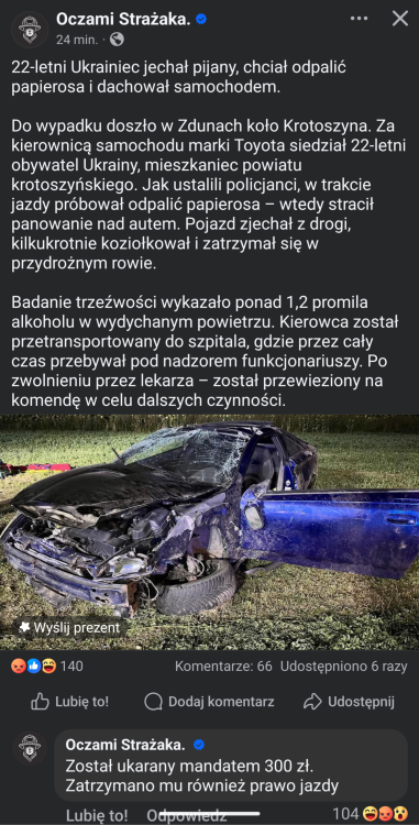 Kilka dni temu w opolskim jakiś dziadek 76 lat TOCZYŁ się 4km/h swoim passatem bez jednej lampy i przeglądu gdzieś blisko do mechanika, akurat napatoczyła się policja, dostał 4500zł mandatu. Dzisiaj w nocy obok Krotoszyna 22 letni ukrainiec z mając 1,2‰ dachował bo chciał odpalić papierosa. Dostał 300zł mandatu. Chyba nie muszę wam tego komentować moimi słowami.