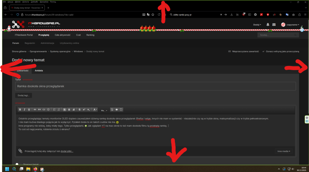 Ostatnio przeglądając tematy monitorów OLED dopiero zauważyłem dziwną ramkę dookoła okna przeglądarek (firefox i edge, innych nie mam w systemie) - niezależnie czy są w trybie okna, maksymalizacji czy w trybie pełnoekranowym. I nie mam kuźwa bladego pojęcia jak to wyłączyć. Pytałem brata to on takich cudów nie ma. Inne programy nie widzę, żeby miały tego. Tylko przeglądarki. Jak oglądam YT na max oknie to też mam dookoła filmu tą przekętą ramkę. To coś od nagrywania, robienia zrzutu z ekranu? Ktoś wie jak to dziadostwo wyłączyć? Nie wiem od kiedy to mam, dopiero teraz zacząłem na to zwracać uwagę.