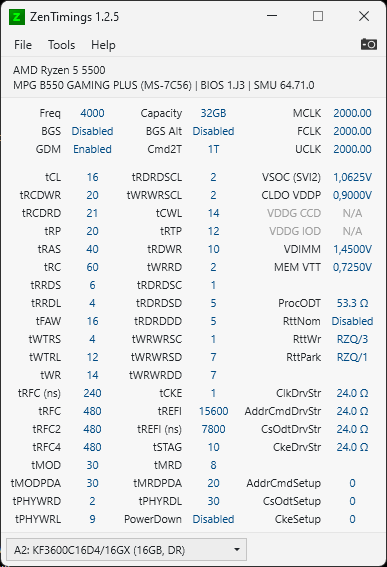 Czyli by zniwelować tak duże różnice w taktowaniu pamięci musiałbym mieć np. Ryzena 5600? To moje ostateczne timingi (raczej). Pamięci to Kingston Fury Renegade, DDR4, 32 GB, 3600MHz, CL16 (KF3600C16D4/16GX) Na 4133 Mhz CL18 raz mi się odpaliły, ale na drugi dzień już nie i już się nie włącza nawet na bardzo luźnych timingach i wysokim napięciu. A szkoda, bo wydajność jest wyższa wtedy. 4000 Mhz CL16 dual jak jak widać jest możliwe na Hynix DJR. Być może to zasługa Ryzena 5500, bo na nie APU byłoby pewnie gorzej.