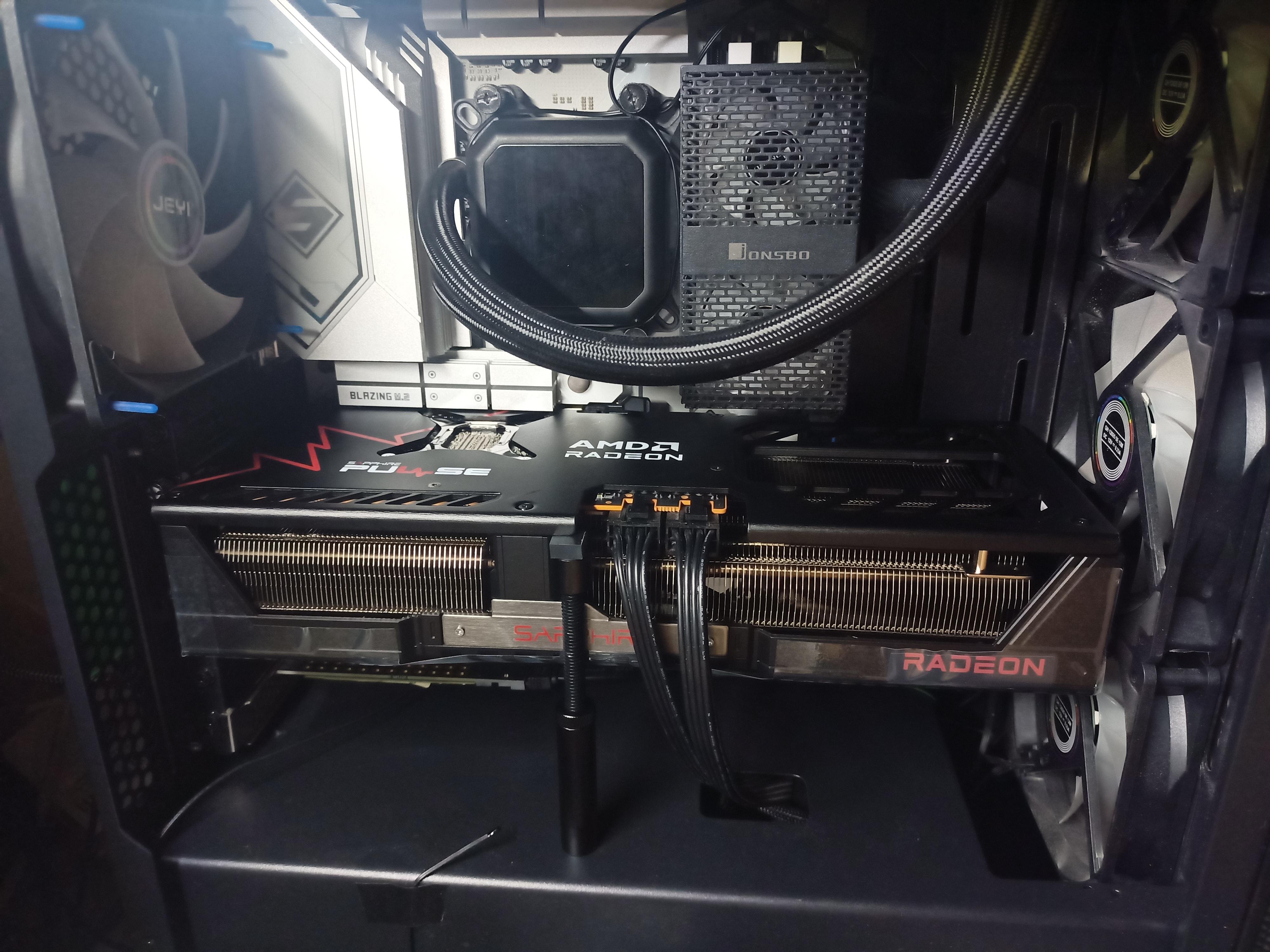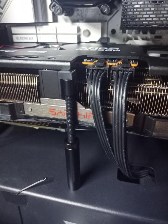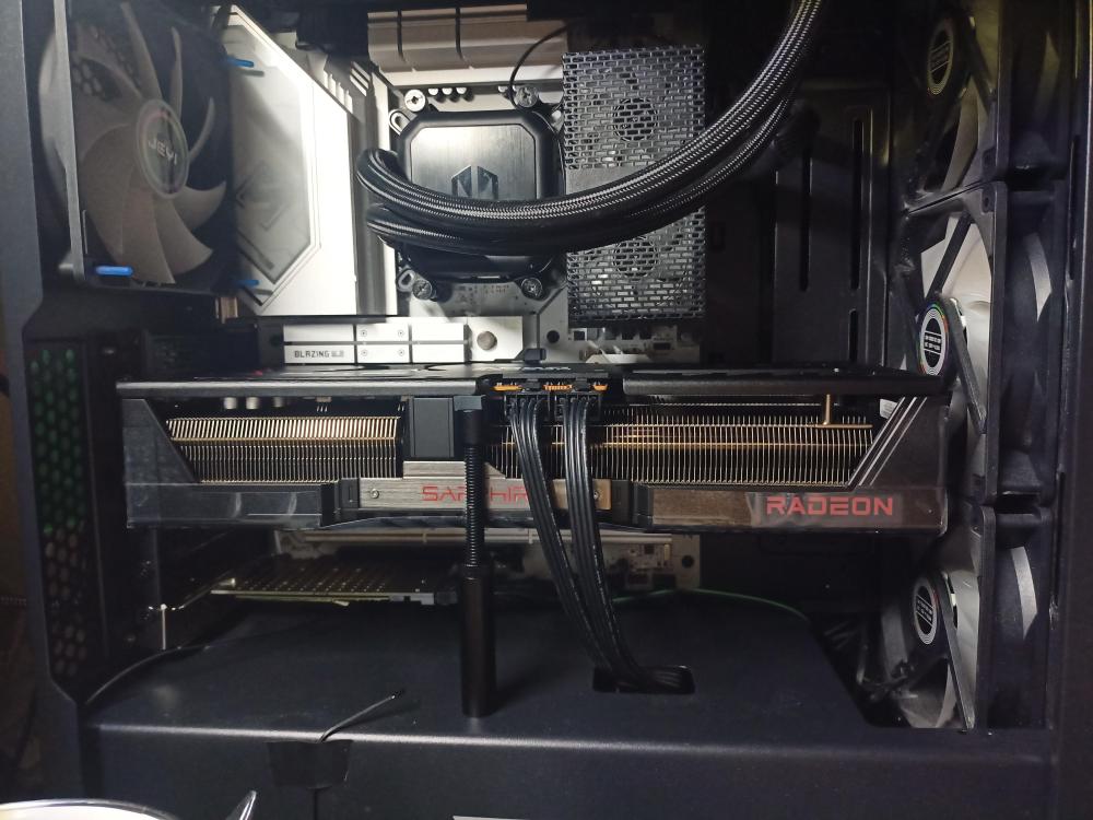 13. U mnie już od 100 w BF6 Kawał klocka z tej karty. Został około 15 mm do wentylatorów na froncie. Podpórka też już nie pasuje bo w minimum jest za wysoka a w maximum za niska aby to podeprzeć, ale miałem kawałek gumki i podłożyłem jako tako. Dobrze, że nie zdjąłem folii bo nie wiem czy ją zostawię. Spodziewałem się czegoś lepszego. Różnica w rozmiarze i wadze spora a Reaper wcale nie gorszy.