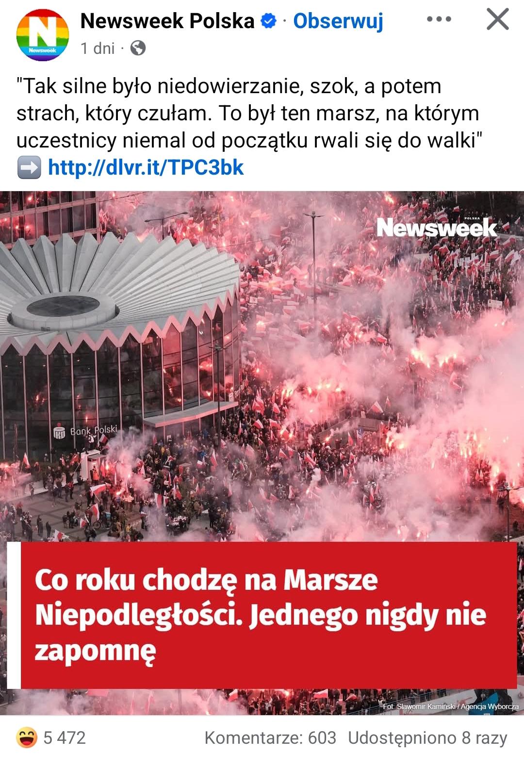 Mi chodzi o poziom kłamstw Newsweeka. "Strach który czułam" i " Co roku chodzę" w jednej sentencji hehe to jak się boi to po co chodzi co roku? Wiadomo że nie chodzi bo to kolejna zmyślona historia Newsweeka żeby pluć na Polaków -