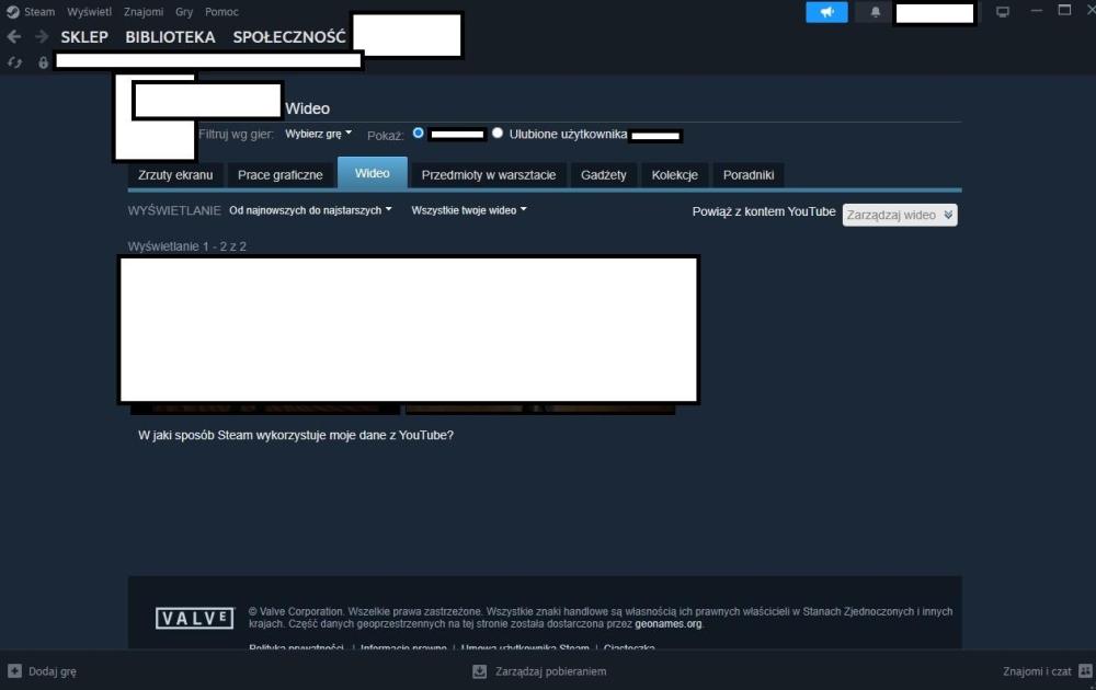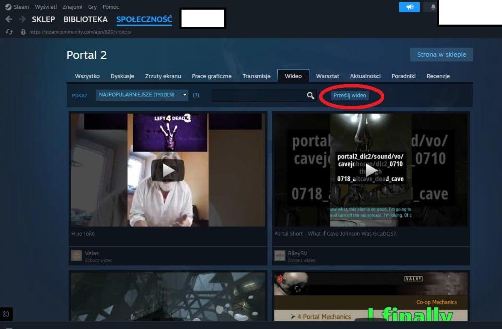 Przy okazji napiszę, bo pewnie większość ogarnia Steama. Wiecie, jak dodać swój film z Youtube do zakładki społeczności, pod konkretny tytuł gry, gdy ma się już kanał YT powiązany z kontem Steam i filmy na swoim prywatnym profilu? Tak jak tu na przykładzie gry Portal 2. Jak się wchodzi na społeczność, do zakładki "video", jest tam opcja zaznaczona u mnie na screenie na czerwono, by przesłać video. Czyli niby wszystko ok. Jak w nią wchodzę, to jest mój profil, gdzie widzę swoje filmy (w tym przypadku 2), powiązane z moim kontem Youtube. No i nie wiem, co dalej. Nigdzie nie widzę opcji, jakiegoś ptaszka do zaznaczenia, by dało się te video zaznaczyć i można je było dodać na walla z filmami całej światowej społeczności gry. Jak to zrobić? To samo jest zarówno w programie Steam na dysku, jak i na www Steam. Oczywiście gry, do których chcę dodać video, mam kupione w bibliotece. Co ciekawe na przykład w zakładce z grafiką "prace graficzne", bez problemu można coś wrzucić na walla społeczności, ale w przypadku zakładki video już nie.