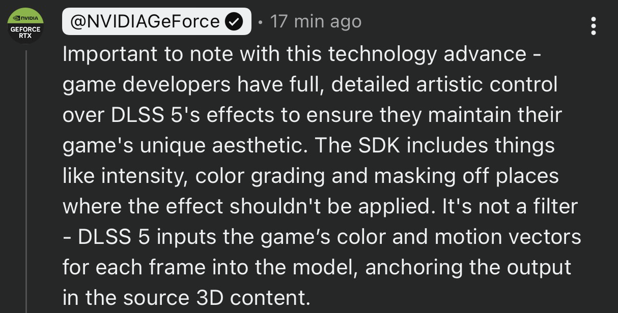https://www.tomshardware.com/pc-components/gpus/jensen-huang-says-gamers-are-completely-wrong-about-dlss-5-nvidia-ceo-responds-to-dlss-5-backlash "Well, first of all, they're completely wrong," "The reason for that is because, as I have explained very carefully, DLSS 5 fuses controllability of the of geometry and textures and everything about the game with generative AI," "It’s not post-processing, it’s not post-processing at the frame level, it’s generative control at the geometry level," he said. "All of that is in the control — direct control — of the game developer,"