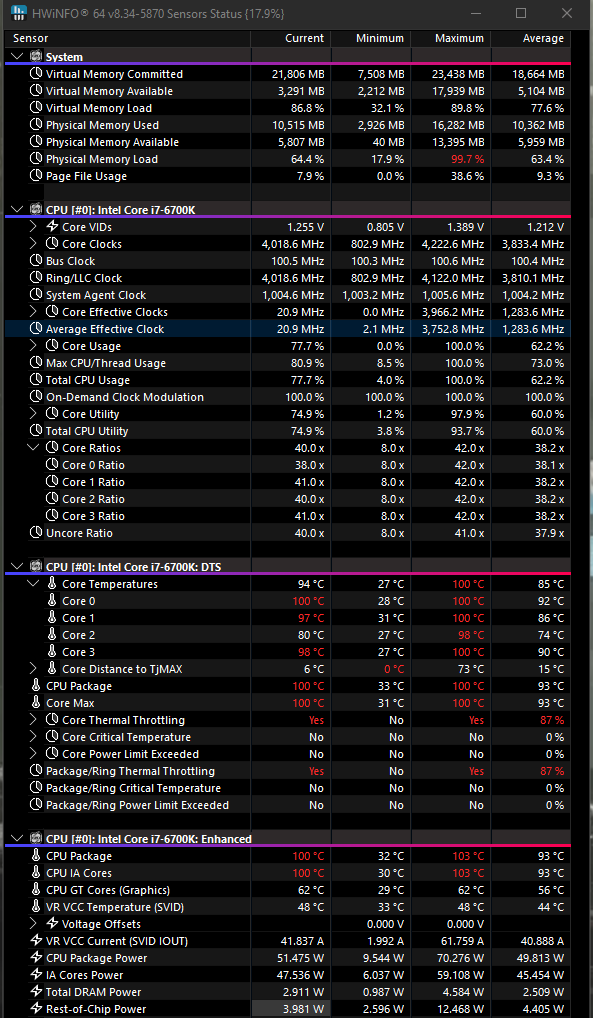 W zeszłym tygodniu kupiłem ENDORFY Fortis 5 Black 140mm i ku mojemu zaskoczeniu w HWInfo zobaczyłem wysokie temperatury. Pierw myślałem, że to wina pasty Thermal Grizzly, bo już stara i trochę chyba zgęstniała, ale zdjąłem chłodzenie i nałożyłem pastę dołączoną do chłodzenia. Niestety efekt ten sam.