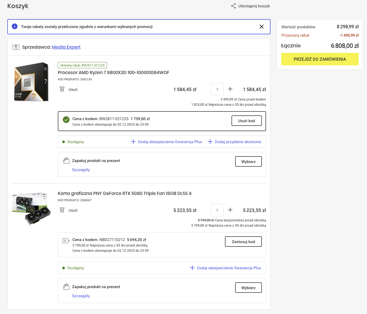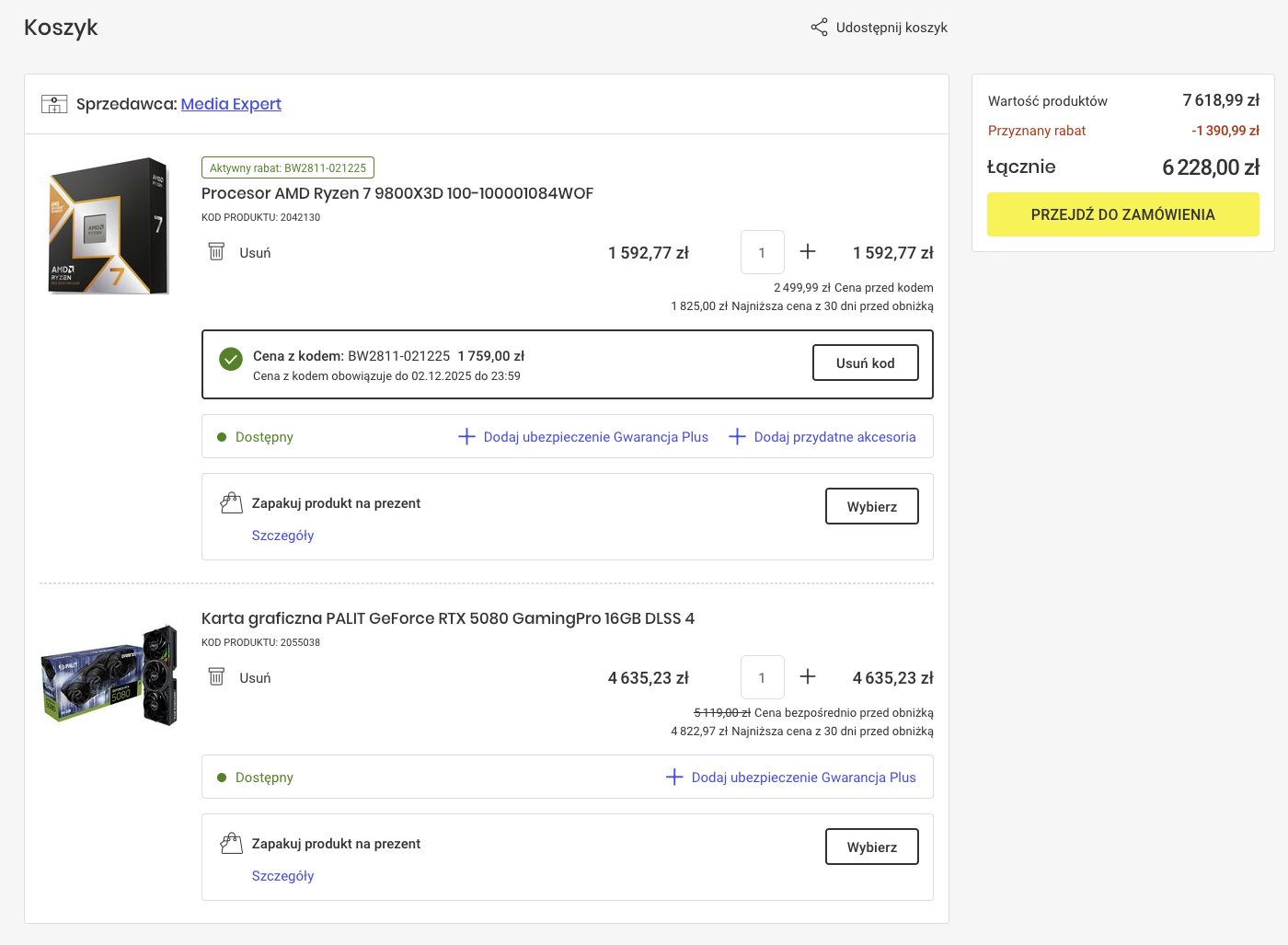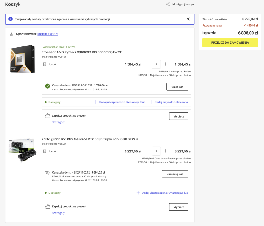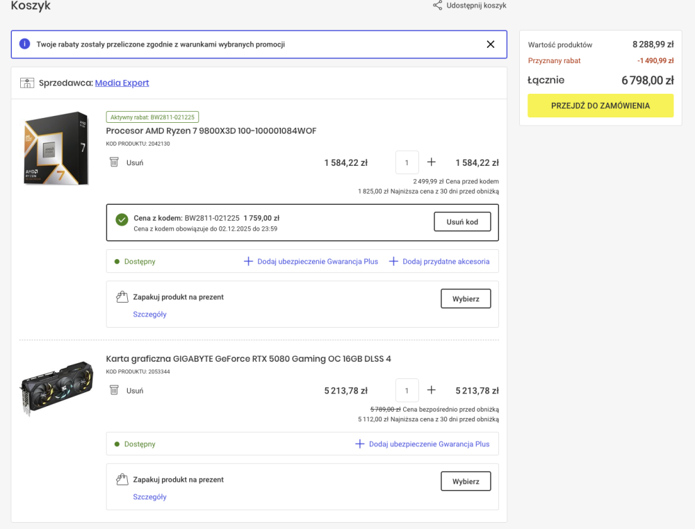 Jest chyba dobra okazja kupic w dobrej cenie CPU + GPU w Media Ekspert. Biorąc pod uwage podlinkowane przez @Dirian modele GPU 5080 i dostępność w sklepie stworzyłem takie zestawy. Wybrałem też najtańsza dostępną w sklepie kartę. Ewentualnie czy z dostępnych w sklepie kart jeszcze coś wartego uwagi i da radę dobrą cenę uzyskać? https://www.mediaexpert.pl/komputery-i-tablety/podzespoly-komputerowe/karty-graficzne/model_geforce-rtx-5080/producent-chipsetu_nvidia?availability_name=Dostępny&sort=price_asc Mam jeszcze w x-kom czekającą na odbiór Gainward GeForce RTX 5080 Phoenix 16GB GDDR7 DLSS4 za 4 399,00 zł i 9800X3D mogę z tej promocji ME wyrwać za 1610 PLN (lub 1510PLN warunki tych rat nie do końca są jasne). Jeszcze musze to potwierdzić, ale od tych cen w koszyku jest jeszcze szansa uzyskać 30 rat 0% i sklep spłaca 3 pierwsze raty. Zestaw 1: 6798 - 3 raty = 6118 PLN za zestaw (CPU - 1425 PLN , GPU - 4691 PLN) Zestaw 2: 6808 - 3 raty = 6127 PLN za zestaw (CPU - 1425 PLN , GPU - 4701 PLN) Zestaw 3 (najtańsza 5080 w ME): 6228 - 3 raty = 5605 PLN za zestaw (CPU - 1433 PLN , GPU - 4165 PLN) -
