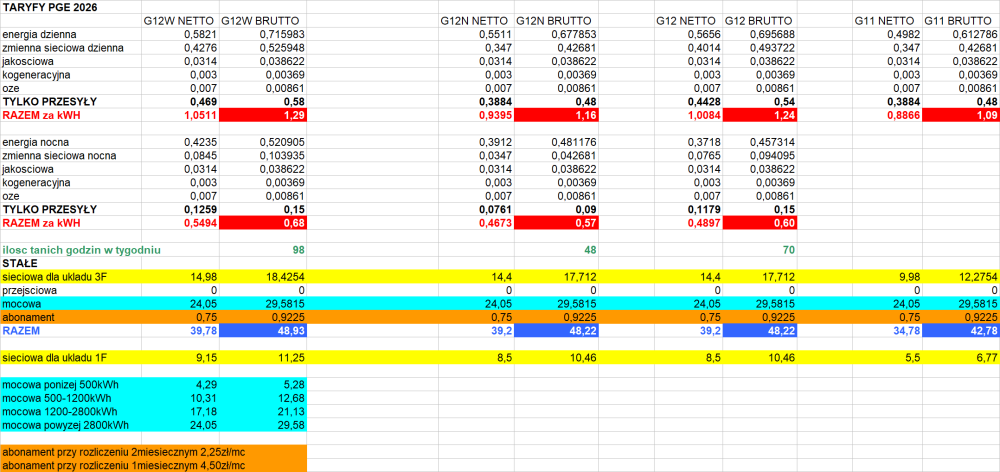 tak, ci co nie maja PV a maja duze zuzycie beda placic mniej policzylem tez takie cos: 1. bez PV w g11 zaplaciłbym 19100zl 2. bez PV w g12w zaplaciłbym 15700zl (zuzycie droga strefa/tania strefa 70/30) lub 15000zl przy (80/20) 3. na nowych zasadach na RCEm jakies 6100-7100zł 4. z magazynem idealnie skonfigurowanym tak ze nic nie pobieram w lecie a w zimie nic nie wysylam, plus calosc energii pobieram w taniej (przy RCEm) mozna by nawet zejsc do 1500-2000zł rocznie 5. na RCE (dynamiczne) nie do policzenia u mnie bo nie mam smart licznika na caly dom, chociaz mozliwe ze z raportow bilansowania mozna by to policzyc ale nie chce mi sie przy duzym magazynue typu 100-200kwh najbardziej oplacalna G12N ja przechodze na G11 bo mam stare zasady a mocowa jest tansza 6zł/mc - rocznie 70zł- zawsze cos