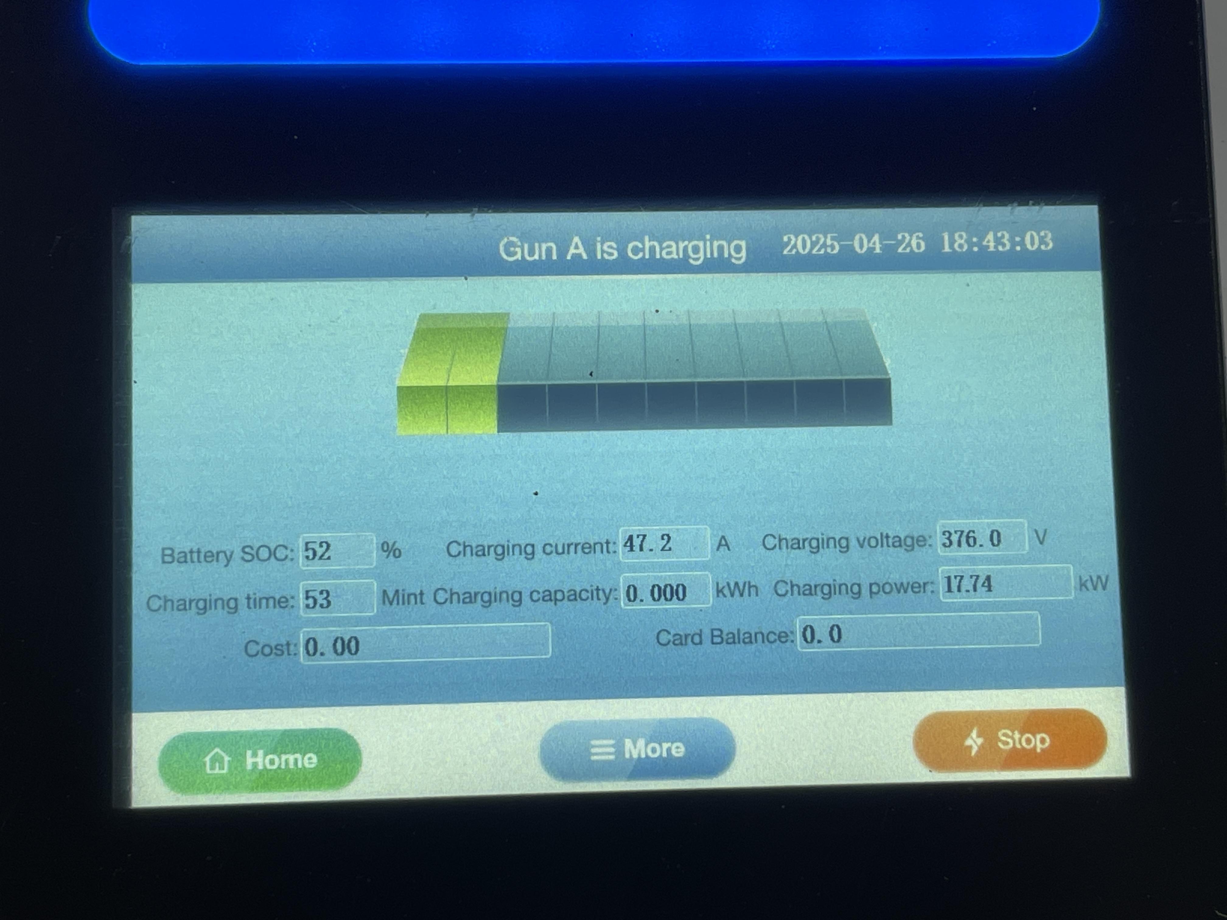 50A to max teoretyczny (na lcd 47,2A max wyswietla) miernikiem cęgowym zmierzylem na wyjsciu i daje 48,5A czyli jesli tesle 3 na li-ion rozładujemy do 0% (napiecie jakies 300VDC) to osiagniemy niecale 15kW ale im wyzszy SoC tym wieksza moc (foto) najszybciej ładowały by sie stellantisy bo one maja 108S pakiety czyli 340-450V wiec juz przy 40% powinno byc w okolicach 20kW do tego odkryłem takie cos jak tryb manual - czyli mozemy ładowac dowolny pakiet (od 200VDC) w gore bez komunikacji CCS -