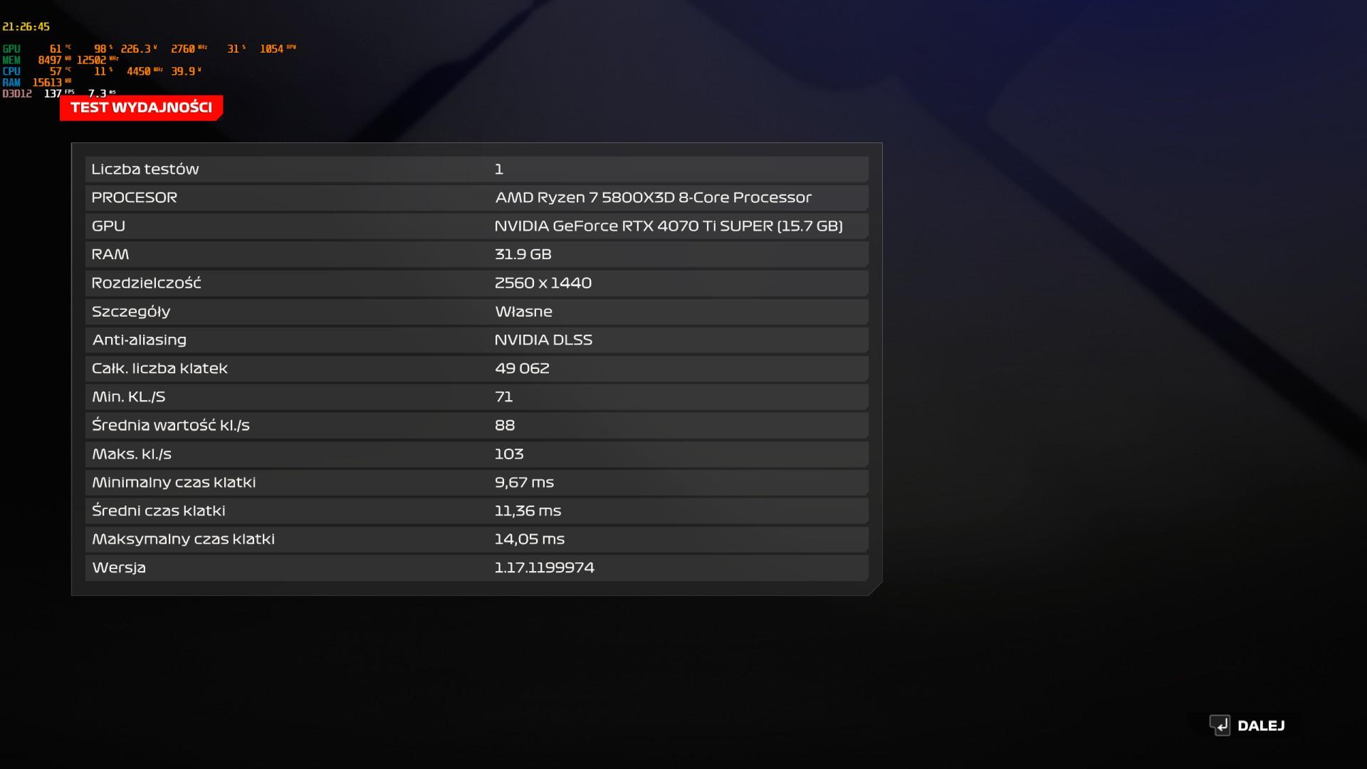 Szybkie testy za mną. Karta nie tak dobra jak Twoja jeśli o OC chodzi ale o niebo lepsza od tego paździocha od Zotaca. OC u mnie to power limit 107%, rdzeń +100 i pamięci +2000 co daje w grach gdzie karta nie dobija do power limitu częstotliwość 2910-2940MHz. Co do UV to zrobiłem sobie dwa profile - 960mV @ 2760MHz i 985mV @ 2820MHz. W obydwu przypadkach pamięci także na +2000. Temperatury to przepaść między MSI a Zotac. MSI chłodniejsze przy wyższym o około 100MHz OC o 5-6C na rdzeniu i HotSpot i ponad 10C na pamięciach a po UV różnice sięgają 10C na rdzeniu i HS oraz 20C(!) na pamięciach. Do 1300rpm na wiatrakach karta z 70cm nie wybija się ponad wiatraki w obudowie. Do 1500rpm z tych 70cm do zniesienia jak komp stoi na podłodze. U mnie grają trochę cewki ale na szczęście nie są to świerszcze ani pisk, tylko jakby sąsiad przypalał kotleta Niesłyszalne jak komp stoi na podłodze a nie na wysokości ucha. Karta ciekawa konstrukcyjnie ale liczyłem na grubsze ścianki tej aluminiowej obudowy, to to tak cienkie, że wydaje się plastikowe no i kolor, ja bym poszedł w szary, grafitowy a nie to złoto czy co to tam jest A tak to całkiem spoko karta Kolejny raz potwierdzenie, że OC i żyłowanie karty potrzebne jest tylko do 3DMarków, widać też drastyczny zjazd z poboru prądu i spadające temperatury karty w budzie. Testy w F1 24 ze wszystkim na max. OC +100/+2000 UV 985mV @ 2820 UV 960mV @ 2760