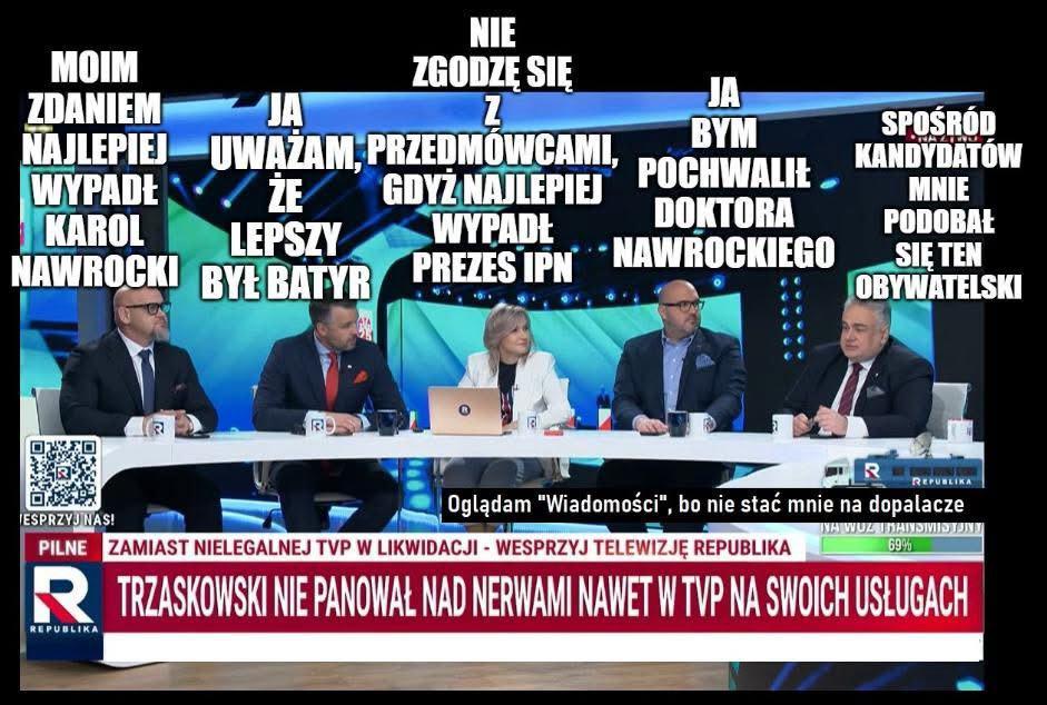 Raczej ten wzrost z 7 do 15, to nie strategia, tylko efekt spolecznego protestu wobec popis i nie znaczy to, ze konfa nagle stała sie siłą zdolna rzadzic. Batyr to produkt pisu, nie przypadek. Kazdy jego ruch jako prezydenta to bedzie parasol ochronny dla ludzi z obozu dudy, nie bez powodu nie krytykuje ziobry, sasina czy bylego krola orlenu. Głos na Rafała, to nie akt ideologiczny, tylko strategiczne przeciwdziałanie dalszemu zawłaszczaniu panstwa przez aparat jaki stowrzyl pis. Jesli elektorat Mentzena marzy o realnym wpływie, to musi najpierw przerwac ciaglosc tej machiny, a dopiero potem budowac swoja siłe. Inaczej za 5 lat znow bedziecie sie cieszyc z 15%, tylko juz jako tło koalicji zjednoczonej prawicy 2.0, z konfa jako cichym wspolnikiem.