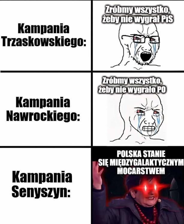 No wlasnie... i dlatego druga ture trzeba potraktowac nie jak zemste, tylko jak zabezpieczenie przed powrotem wladzy w rece starego kaczora i jego partyjnych zombie. Trzask nie jest idealny, ale przynajmniej nie przyszedł z ipnu i nie ma planu wycinania wszystkich, ktorzy maja inne zdanie, A to, ze ludzie sa zmeczeni popis, nie znaczy, ze maja sobie strzelic w kolana nawrockim