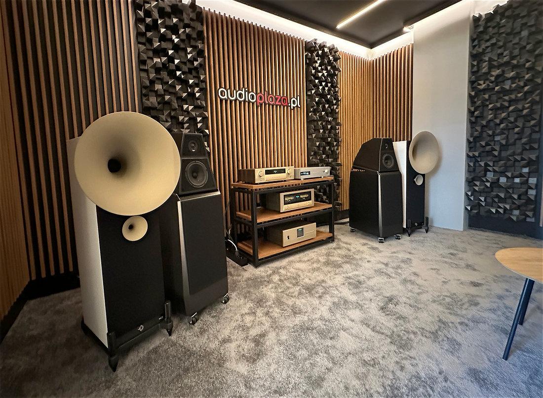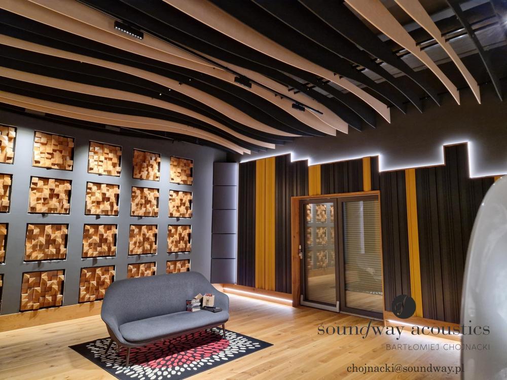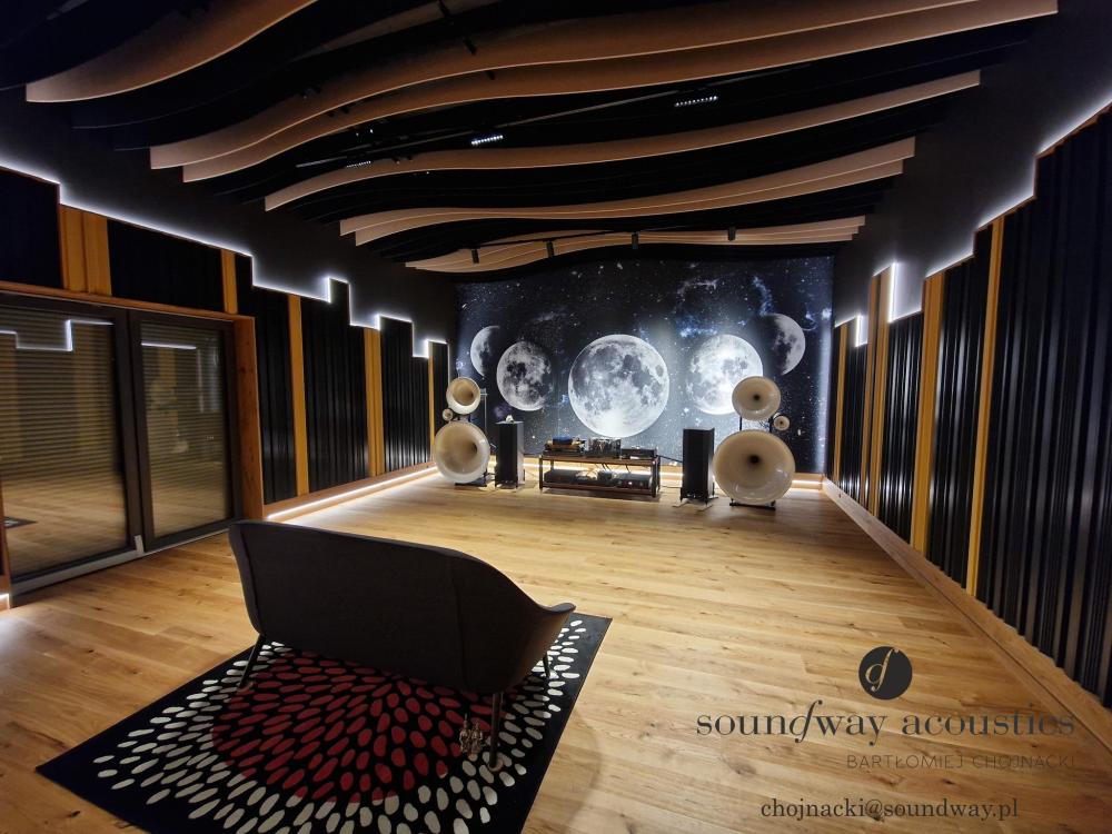 Zobacz salony audioplaza. Nie wiem akurat, czy te ich lamele to też pod kątem akustyki, czy estetyki, ale oni mają tam napchane pod sufit wszystkiego. A tutaj jeszcze pokoik premium, nad którym też pracował Pan Chojnacki. Jak jest budżet, to bywa więcej, niż punktowo.