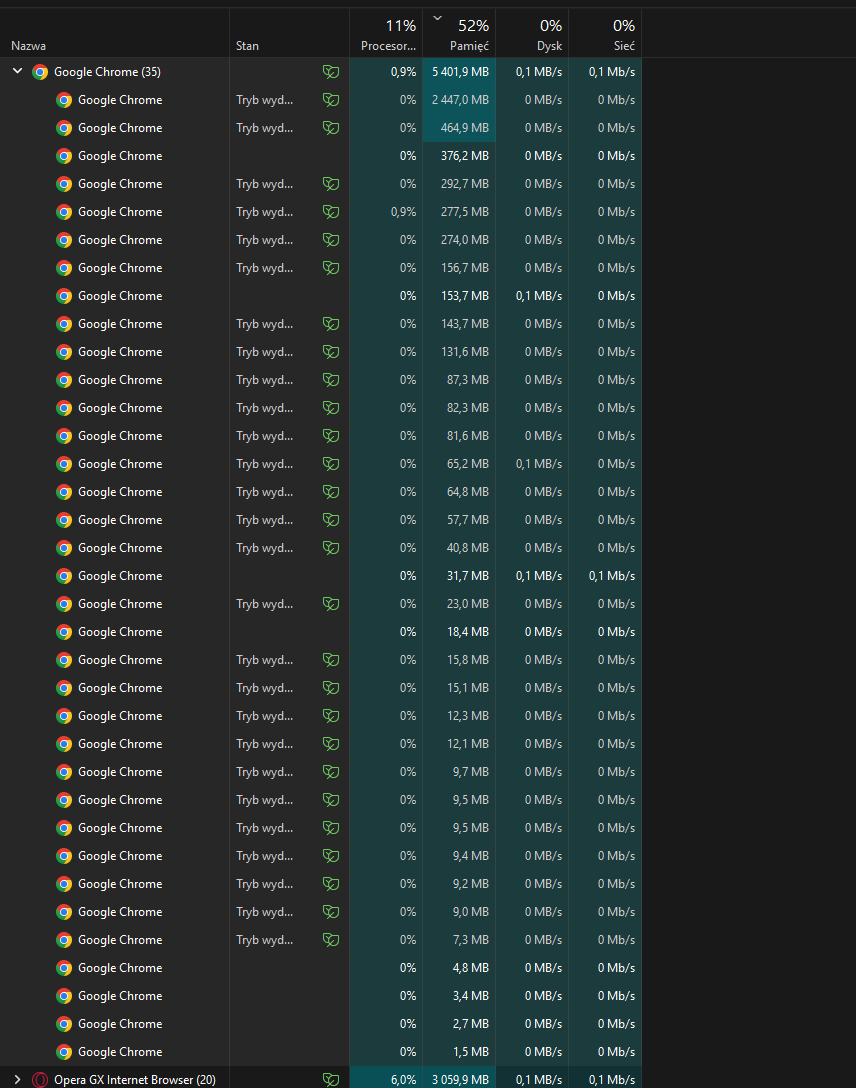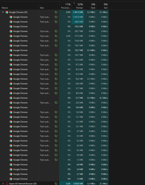 Cześć zacznę od specyfikacji pc: 2x16gb ddr5 6000mhz ryzen 9800x3d rx 9070 xt od jakiegoś czasu miałem spore zużycie ramu w przeglądarce -myślałem że nazbierało się syfu bo dawno nie robiłem formatu pc tak więc dzisiaj zrobiłem format windowsa 11 ,usunąłem wszystkie rozszerzenia na google chrome ale duże zużycie ram jest dalej... w chwili pisania posta chrome pobiera 5,3gb ramu a mam otworzone : 3 karty z yt ( wszystko zapauzowane) facebook,gmail,instagram ,forum ithardware..... i tyle opera gx podobnie -otworzony facebook ,instagram i 3gb zużycia ramu poniżej załączam zrzut ekranu z menadżera zadań (dlaczego jest tyle procesów chrome skoro nawet tyle kart nie mam otwartych i ani 1 rozszerzenia zainstalowanego?) ps: dlaczego po formacie jak chce zrobic ss (print screen) przeglądarki ,pulpitu itp to działa a jak otworzyłem menedżer zadań to ss nie da się zrobić?