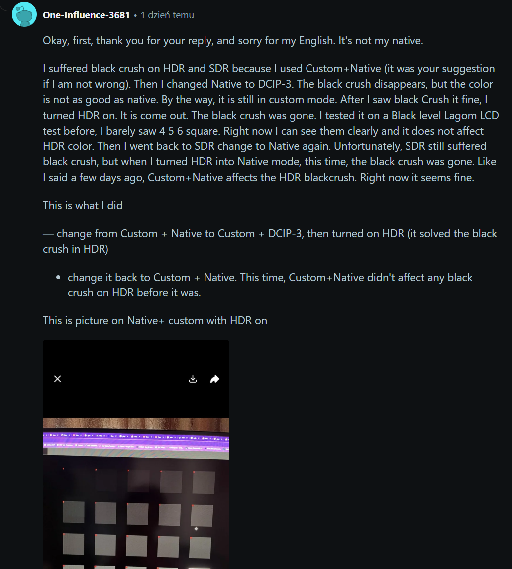Pozostaje przetestowac jeszcze Asusa na true black glossy jak wyjdzie ;p Ale obawiam sie ze przez "lustro" w moim pomieszczeniu bedzie nieuzywalny. Ogolnie mialem woled 2 gen od lg, qd-oled 3gen od Gigabyte Aorusa i meczyly mi wzrok oraz jasnosc dawala wiele do zyczenia. Tutaj obraz nie meczy mi wzroku, duza mozliwosc regulacji, wystarczajaca jasnosc, znacznie lepsza czcionka, przy moim klatkarzu 150 fps+ vrr miga tylko w menu, w samej grze jest ok nawet bez antiflickera, niesamowita plynnosc ruchow i czysty obraz (typowe dla OLED) w porownaniu do mojego ips FI27Q-P, HDR petarda w takim cyberku. Ogólnie jestem bardzo zadowolony. Brakuje mi tylko jednej opcji na ktorej oszczedzil Gigabyte a mianowicie na Black Equalizer w wersji 2.0, na FO27Q3 oraz w moim FI27Q-P to miałem i bardzo pomagało mi to w gierkach fps zwlaszcza w Hunt Showdown ;p Tutaj musze sie pobawic gamma, i tym wstretnym black eq 1.0 co rozjasnia wszystko. To juz mogli dac AI Black Equalizer co jest w M27Q3, wyglada tak samo jak 1.0 z roznica ze wykrywa jasniejsze punkty i ich nie rozjasnia.