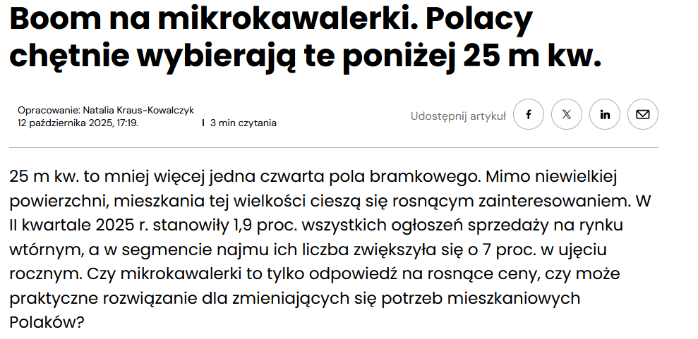 Polacy coraz częściej wybierają mniejsze mieszkania, bo są bardziej praktyczne i ekonomiczne. W takim lokum nie trzeba sprzątać aż tyle, co w dużym domu - to oszczędność czasu i energii. Mniejsze przestrzenie szybciej się nagrzewają, dzięki czemu jest w nich cieplej i przytulniej, zwłaszcza zimą. To wszystko sprawia, że życie w niewielkim mieszkaniu może być wygodne i komfortowe. To wcale nie jest tak, że powstaje coraz większa pula osób, których na normalne mieszkanie nie stać, więc mieszkają w kojcu dla psa. -