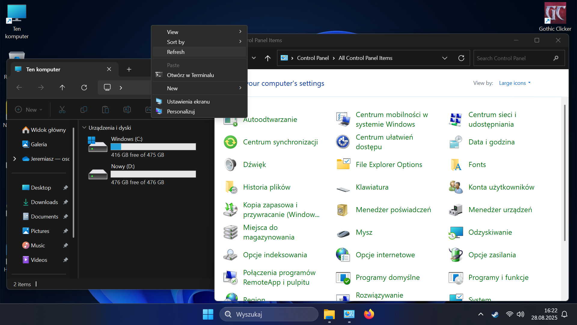 Witam Więc tak, w moim mini pc był zainstalowany Windows, przy pierwszym uruchomieniu w kreatorze był po angielsku i dopiero po konfiguracji pobrałem po polsku wszystkie paczki języka polskiego programisty i dałem na region polski mimo to dużo rzeczy jest po angielsku jak na obrazku, przeszkadza mi to. Co robić by było po polsku ? Pliki np. File Explorer options zamiast eksplorator plików, na bocznym pasku desktop pictures itp i wiele więcej