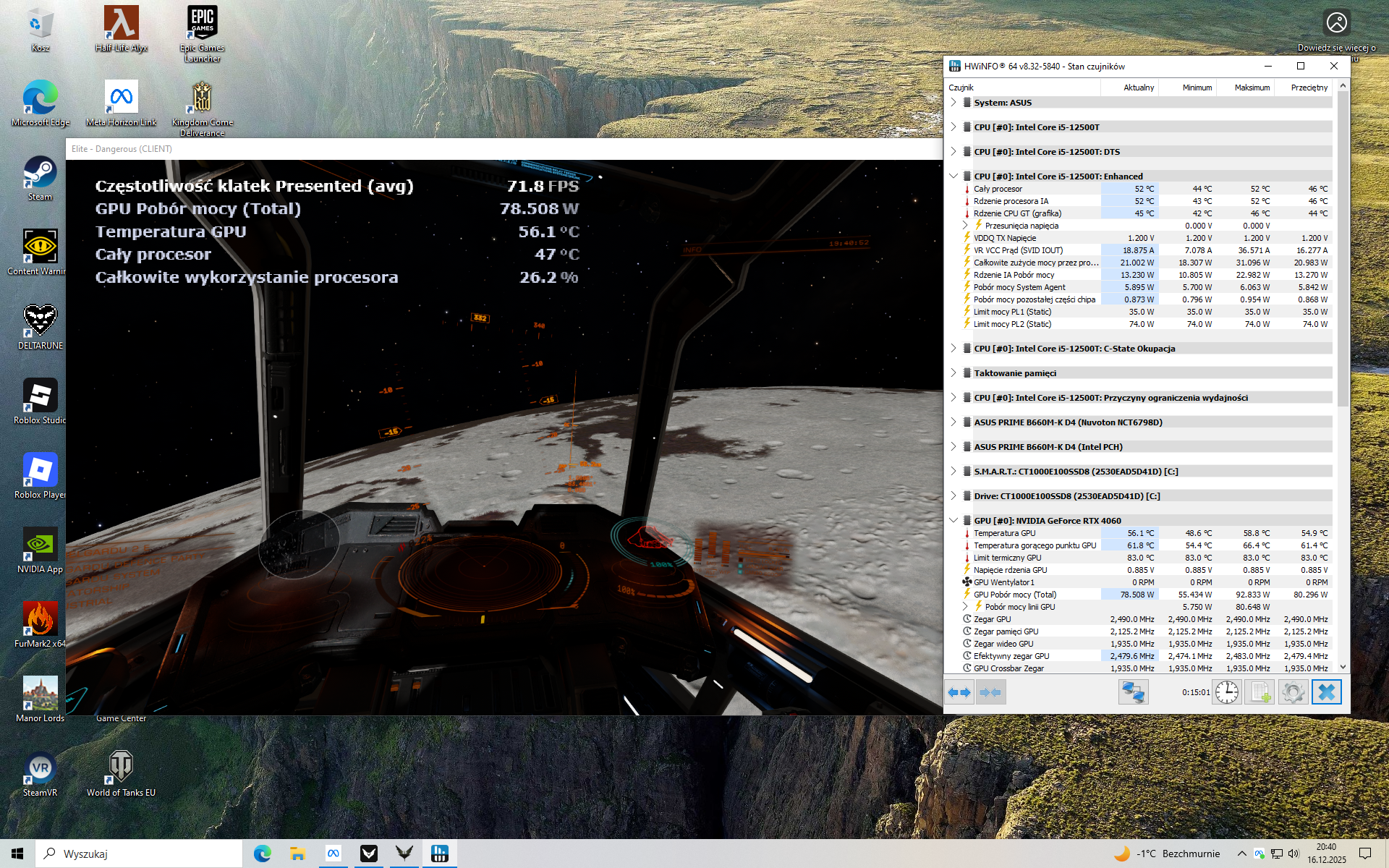 Kolejne dwie gry, tym razem VR (Oculus Link 72 Hz)-Asgards Wrath Vr: Tutaj na RX 6600 dało się grać wyłącznie na minimalnych a na RTX 4060 na Epic czyli maksymalnych, render 100%. Half Life Alyx Vr: Wierność wysoka, na RX 6600 średnia. Jak widać jest spory zapas mocy, GPU się trochę nudzi.
