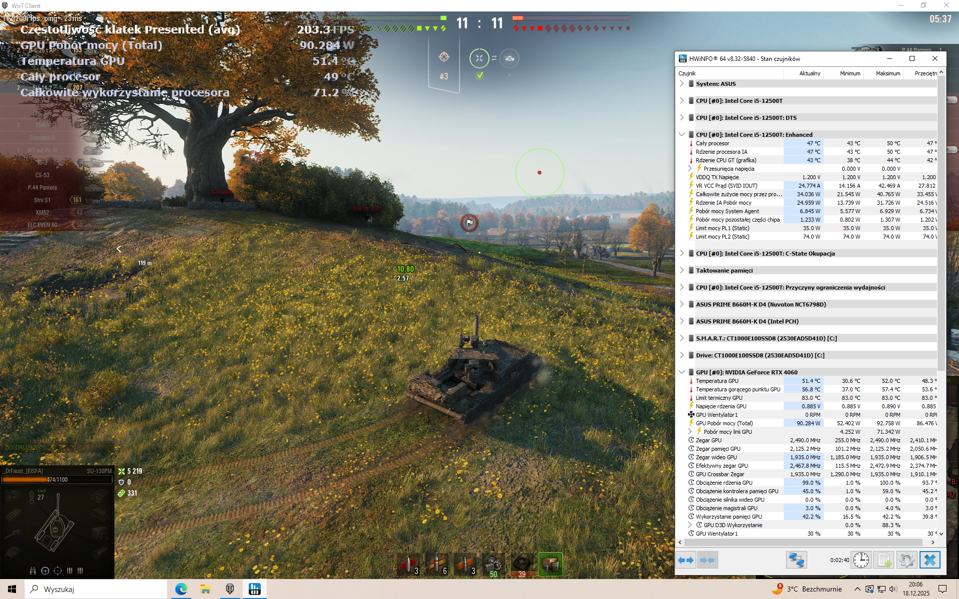 To jest jak pisałem w specyfikacji i5 12500T. Literka T oznacza procesor fabrycznie zblokowany na niższym TDP (w tym przypadku 35W). Potrzebowałem procka z integrą i trafił mi się taki w dobrej cenie. Do RTX-a 4060 jest w sam raz, jest tylko nieco wolniejszy od 12400F na pełnym obciążeniu, a na 50-60% (czyli w grach) to jest dokładnie to samo. Fakt, trochę lipa bo radiatory sekcji procesora zimne podczas grania .