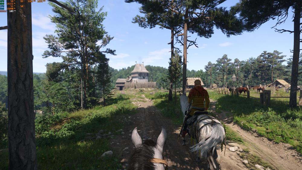 Nocną porą pozdrawiam z Kingdom Come Deliverance II Udało się jeszcze bardziej Vanguarda podkręcić i teraz trzyma te 3260MHz Bestyjka (Nakładka włączona do zobrazowania nastawów, pod F3 makro do ukrywania jej, co by nie zaburzyć immersji )
