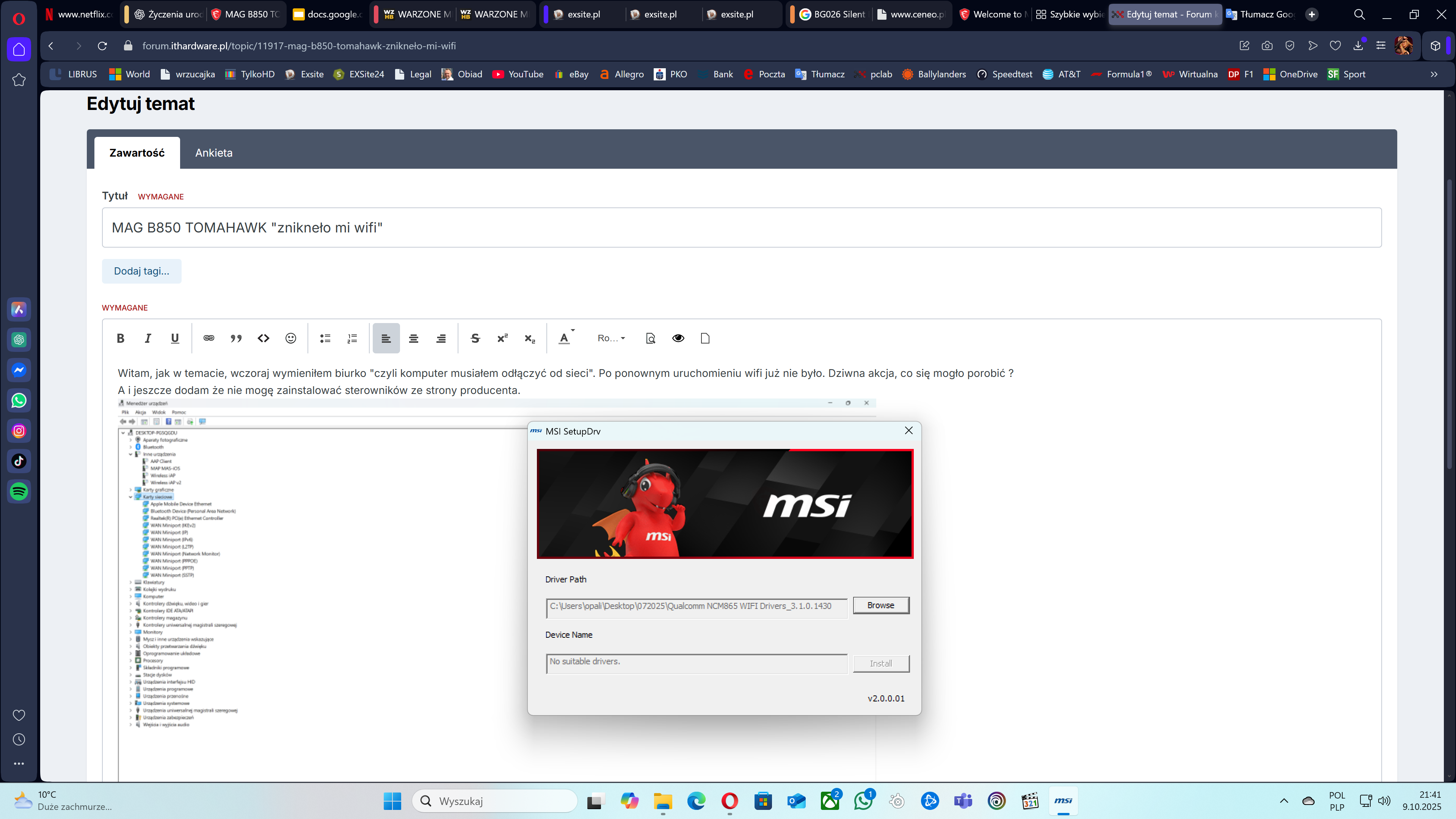 16. Witam, dziś złożyłem nowy komputer i mam nie mały problem z wifi. Zainstalowałem nowy system i sterowniki ze strony MSI, ale wifi mi nie działa. Macie jakiś pomysł jak zainstalować wifi?