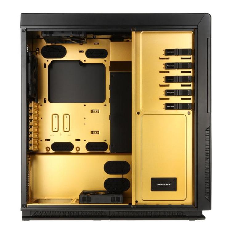 Tak się przyglądam dyskusji, szczególnie tym złotym a skromnym rozwiązaniom to też się przyznam, że parę lat wstecz wziąłem Phanteksa Enthoo Primo w kolorze GOLD. Powód był prosty - był dwie stówy tańszy niż każdy inny kolor. Sęk w tym, że miał szybę z boku. Nie ukrywam, że trochę wioska była - bo cały "premium splendor" był widoczny. Jak ktoś nie pamięta jak toto wyglądało to załączam zdjęcie.