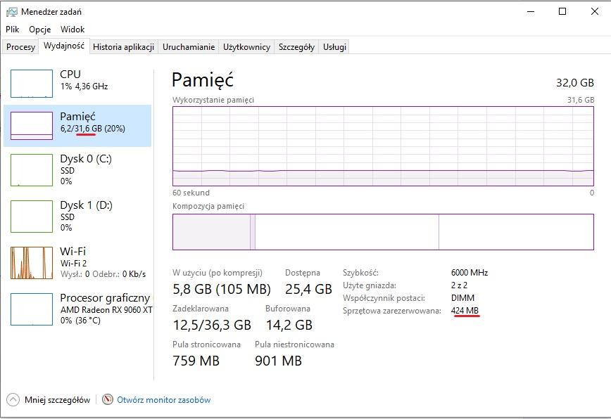 czy to normalne, ze system nie pokazuje calych 32gb? cos rezerwuje 424mb, mam 7500f wiec to przeciez nie igpu