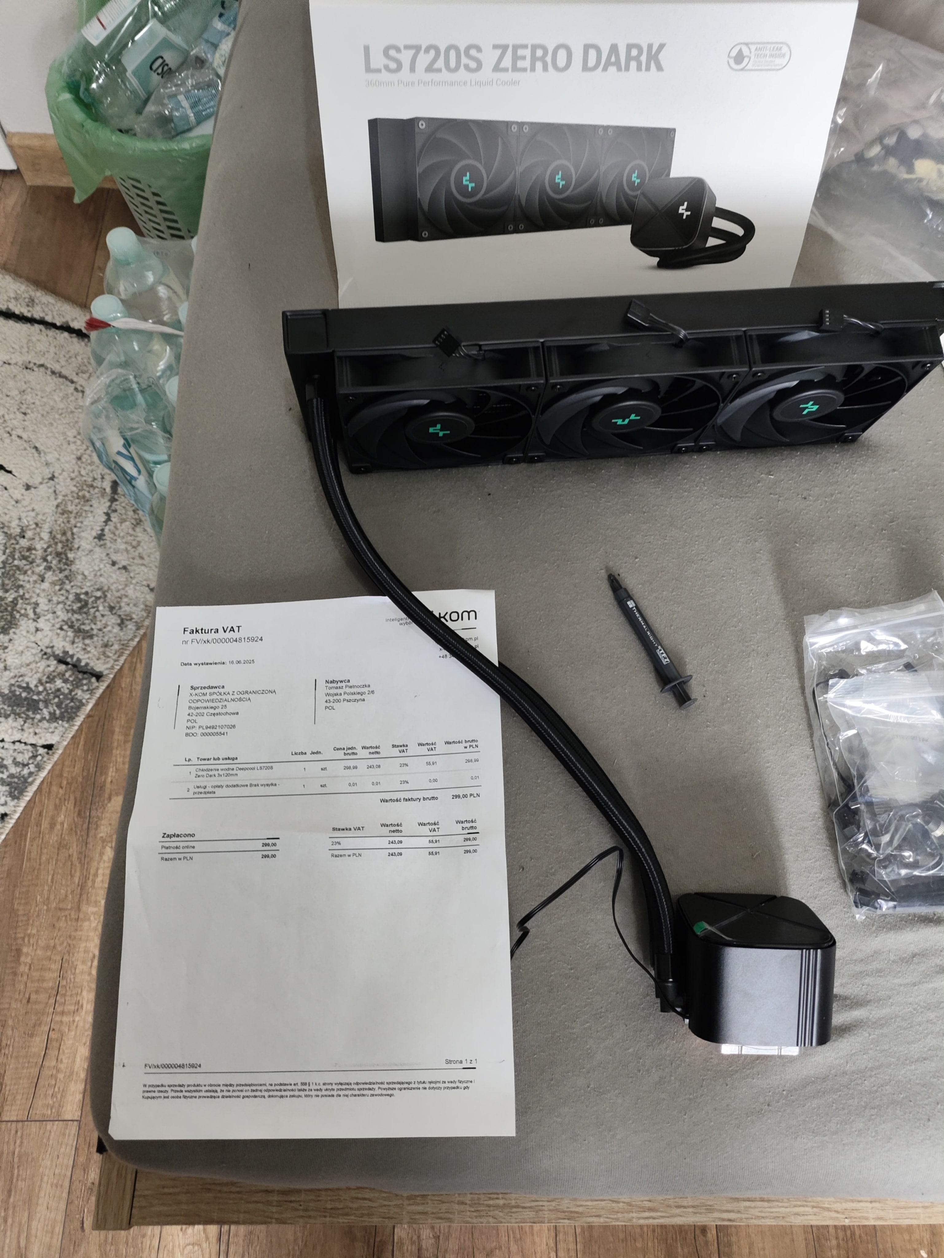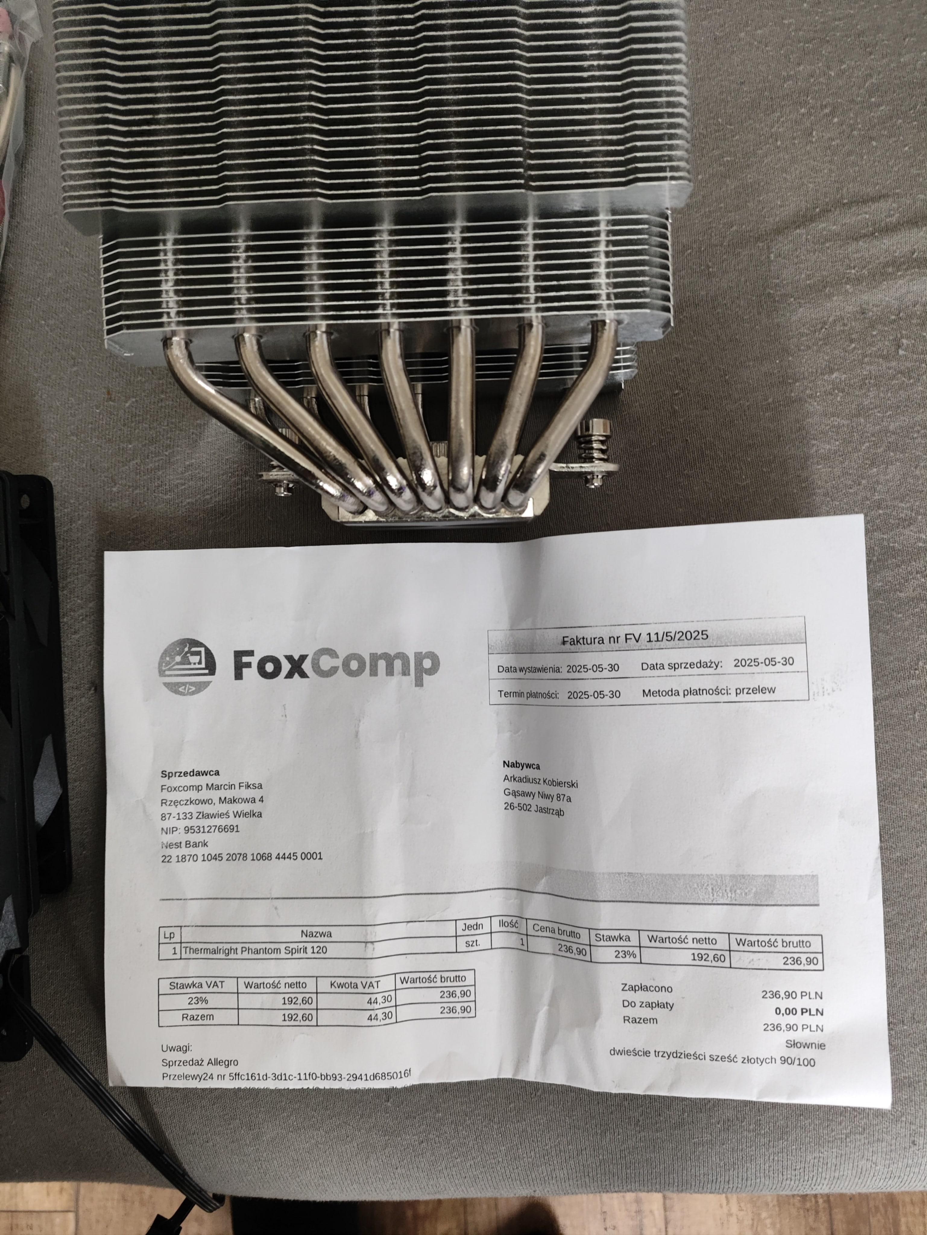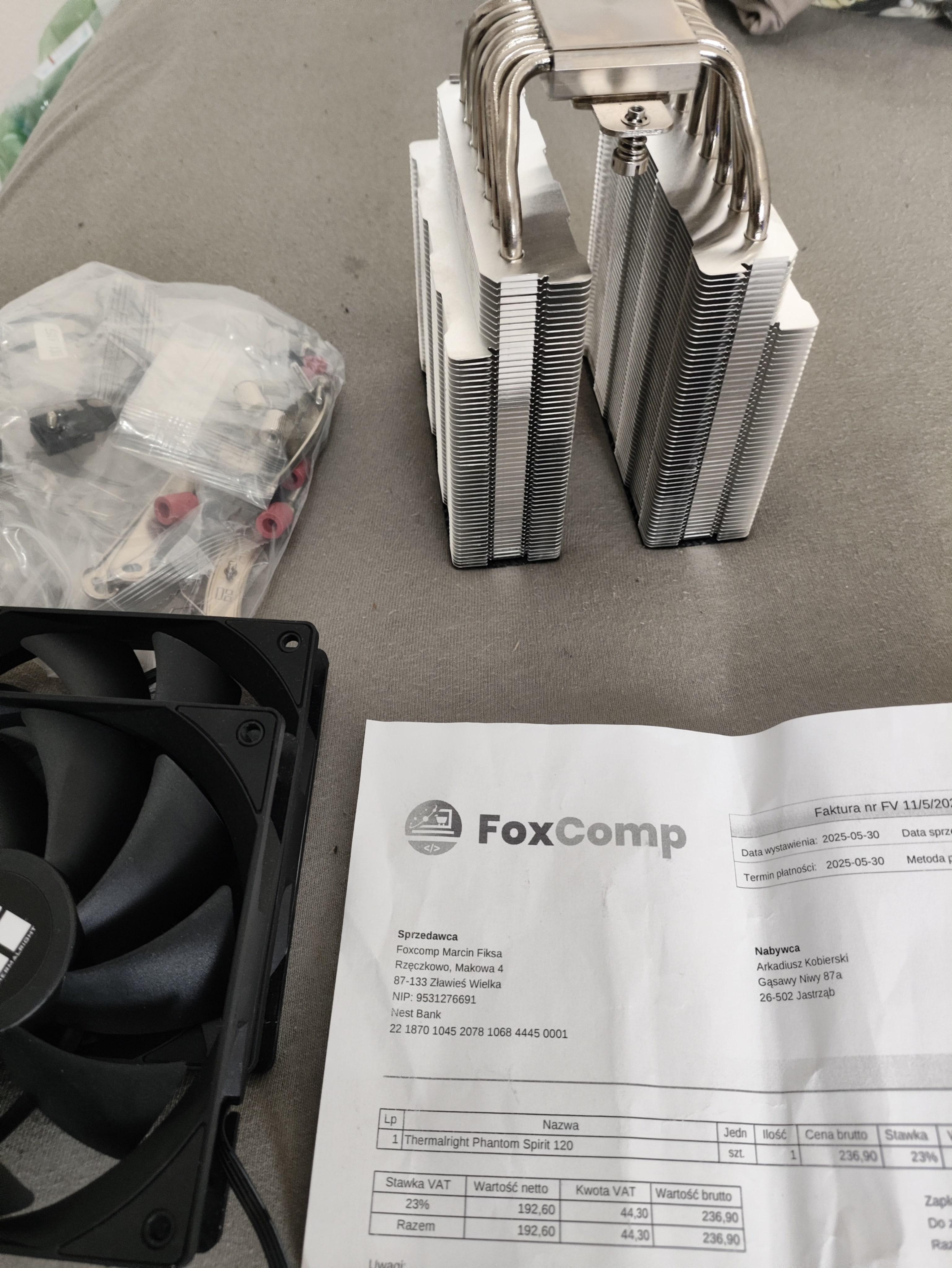 Witam Do sprzedania 2 chłodzenia,można powiedzieć że jak nowe po testowe.Oba w bdb stanie,z całym kompletem oraz dowodami zakupu czyli pełną gwarancją producenta. 1. Thermalright Phantom Spirit 120mm(nie mylić z wersją SE) Cały komplet,kupione w FoxComp 30.05.2025r Gwarancja 36 albo 24mc musiałbym sprawdzić.Używane 2tyg z 7800x3d,potem zmienione na Aio.Oryginalne wentylatory nie były używane. CENA 170zł+KW 2.Aio DeepCool LS720S Zero Dark,kupione w Xcom 16.06.2025,pełen komplet,.Używane nie cały tydzień także na 7800x3d. Cena 260+kw. Mogę wystawić na OLX,Allegro,wtedy dochodzą koszty prowizji.