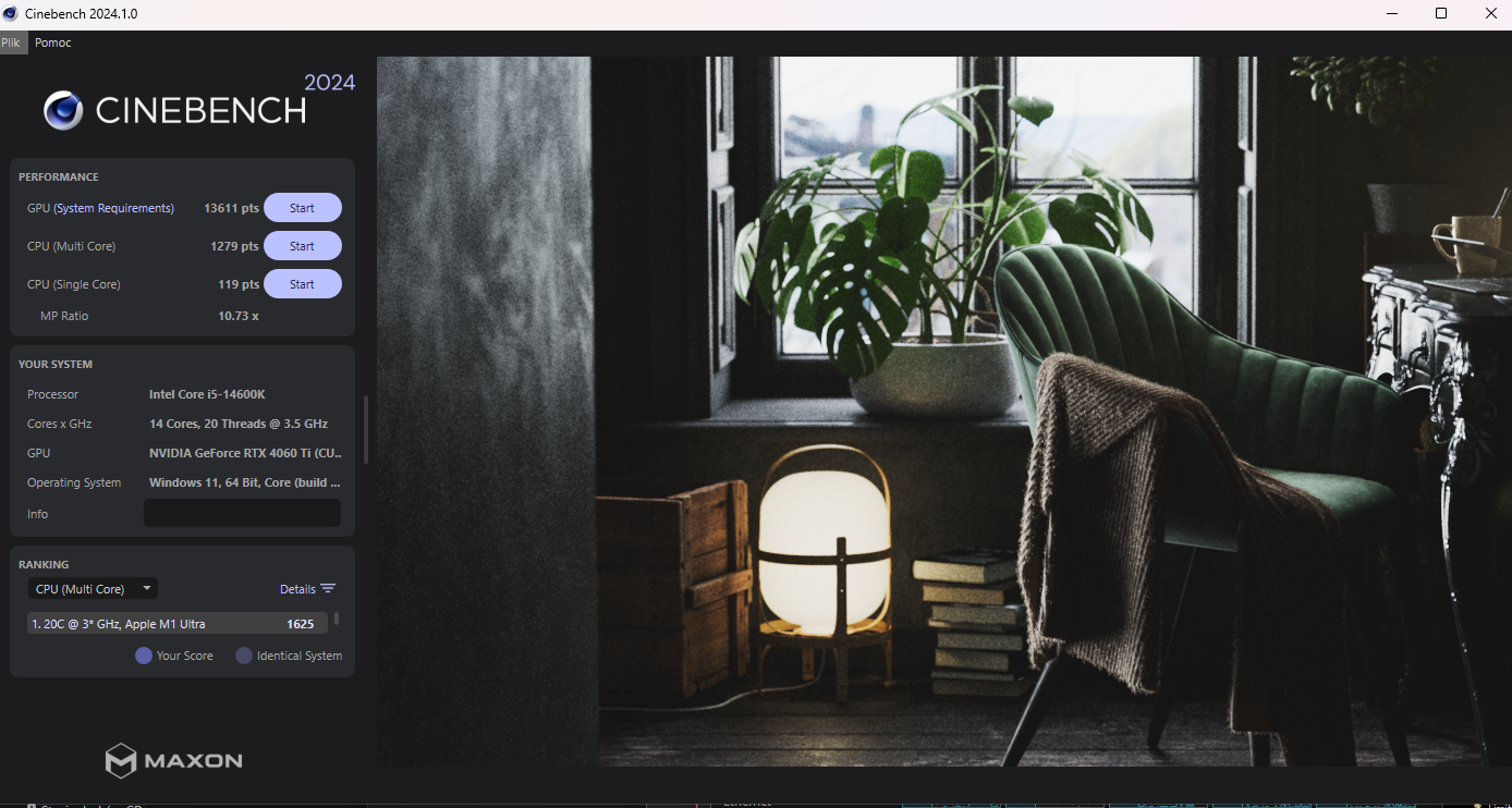 Chyba go zostawię, osowję się z temperaturami bo nie chce mi się znowu grzebać w sockecie :) Zrobiłem test w Cinebench 2024 i w sosunku do testów z pure ucina coś wydajność na multicore - mam 1279 pkt zamiast 1432. W single core test się prawie zgadza - ja mam 119 pkt, na pure wyszło 124. Może być to wina że mam DDR4? Patrzyłem na testy ithardware, jednak @tomcug nie wykonywał tego testu.